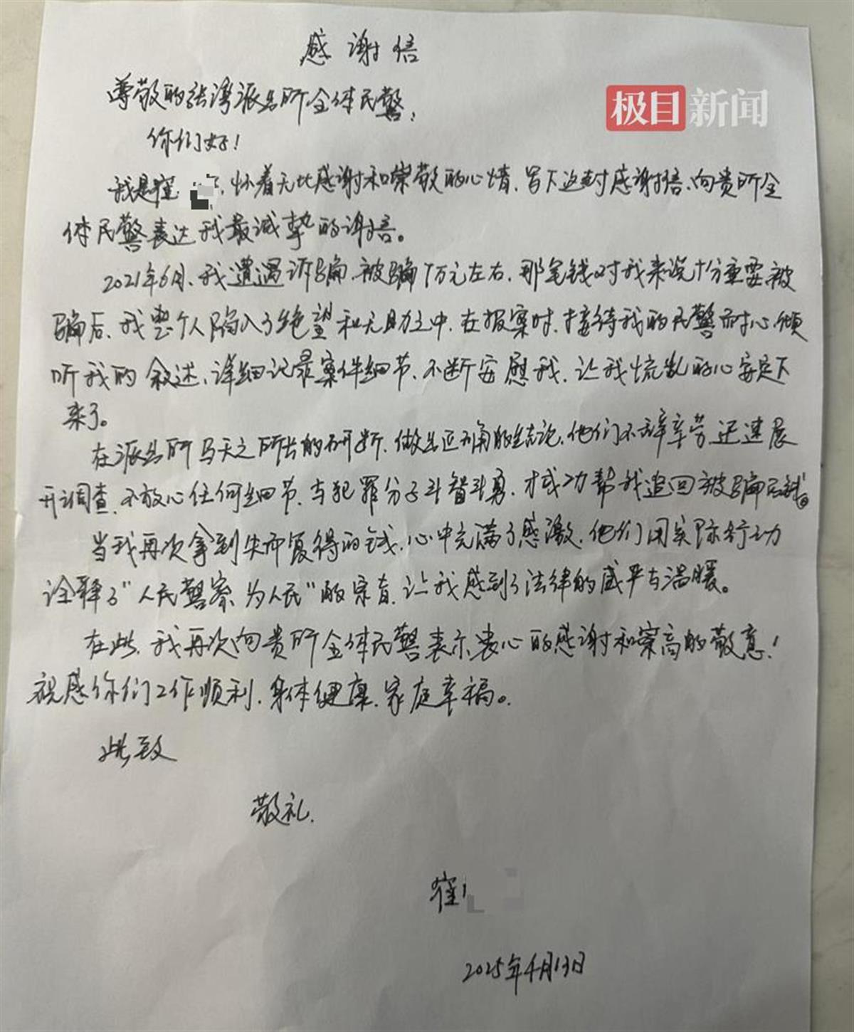 崔女士向办案民警送上锦旗和感谢信(通讯员 供图)