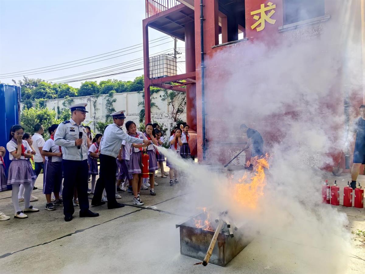 在装备体验区,消防宣传员向学生详细讲解了灭火器使用要领,并指导师生进行实操演练。