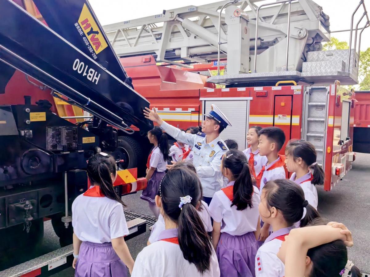 “这辆是抢险救援车,车顶的‘机械手臂’能剪断钢筋!”活动现场,在消防宣传员的带领下,学生围着消防车“探秘”。