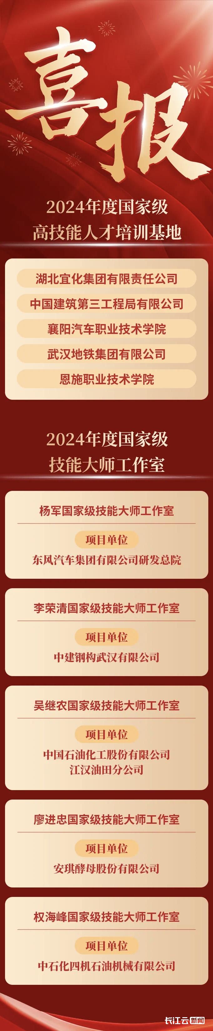 4月15日,长江云新闻记者从湖北省人社厅了解到,近期,人力资源社会保障部办公厅、财政部办公厅公布2024年国家级高技能人才培训基地和技能大师工作室项目单位备案名单,湖北省5家国家级高技能人才培训基地、5家国家级技能大师工作室入选。