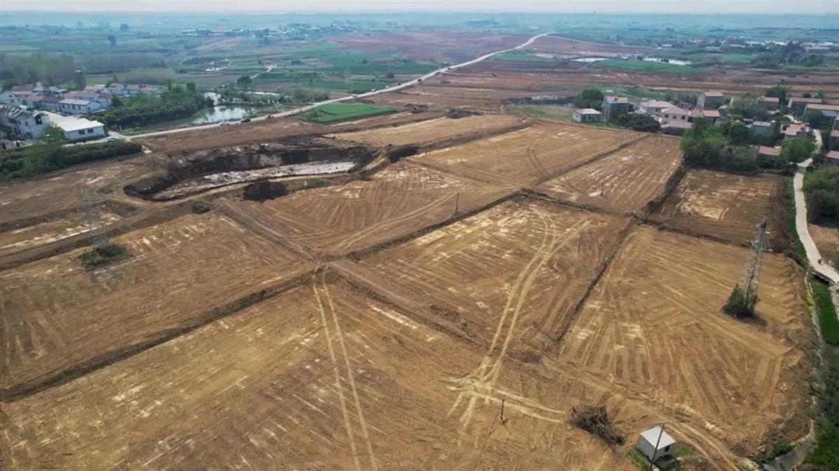 4月8日上午,孝感市孝南区杨店镇浐川片区农业生态融合项目现场机械轰鸣,十几台挖掘机舒展铁臂整理田垄,推土机将细碎的田埂推成规整的缓坡,原本零散分布的"豆腐块"田地在机械交响中逐渐显露出开阔面貌,高低不平的丘陵地块瞬间连成一片,恍若巨幅农耕画卷正徐徐展开。