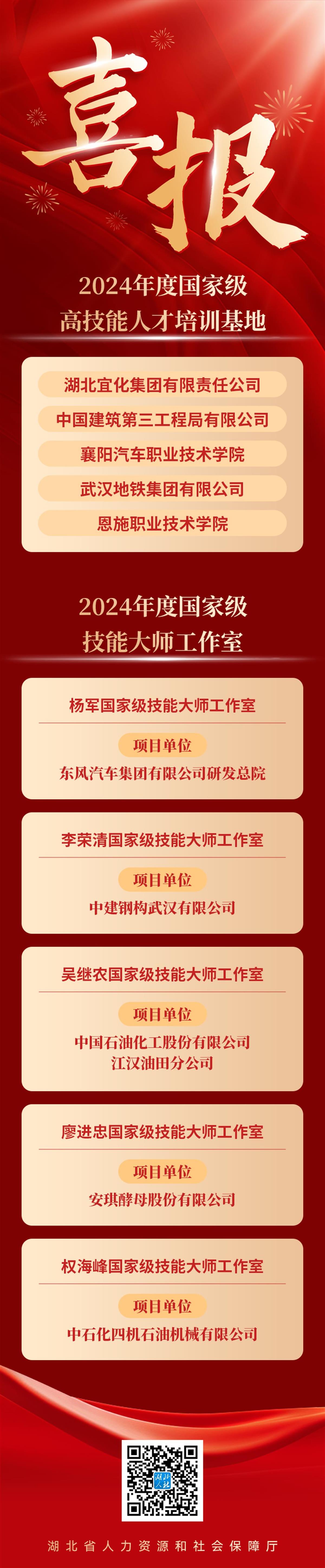 4月15日,新闻记者从湖北省人社厅了解到,近期,人力资源社会保障部办公厅、财政部办公厅公布2024年国家级高技能人才培训基地和技能大师工作室项目单位备案名单,湖北省5家国家级高技能人才培训基地、5家国家级技能大师工作室入选。