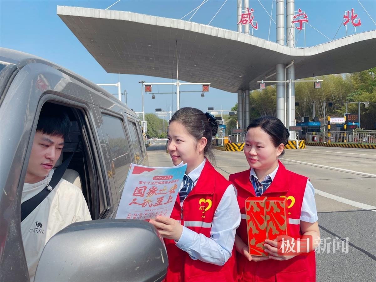 “先生你好,这份手册里有国家安全知识精讲,扫码还能观看宣传片!”在咸宁北收费站,志愿者小杨将《国家安全宣传手册》递给过往司乘,同时指向手册上的二维码,向过往司机宣传讲解国家安全与个人安全的紧密联系。