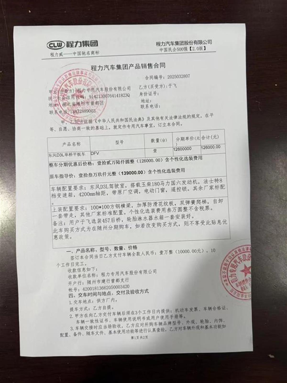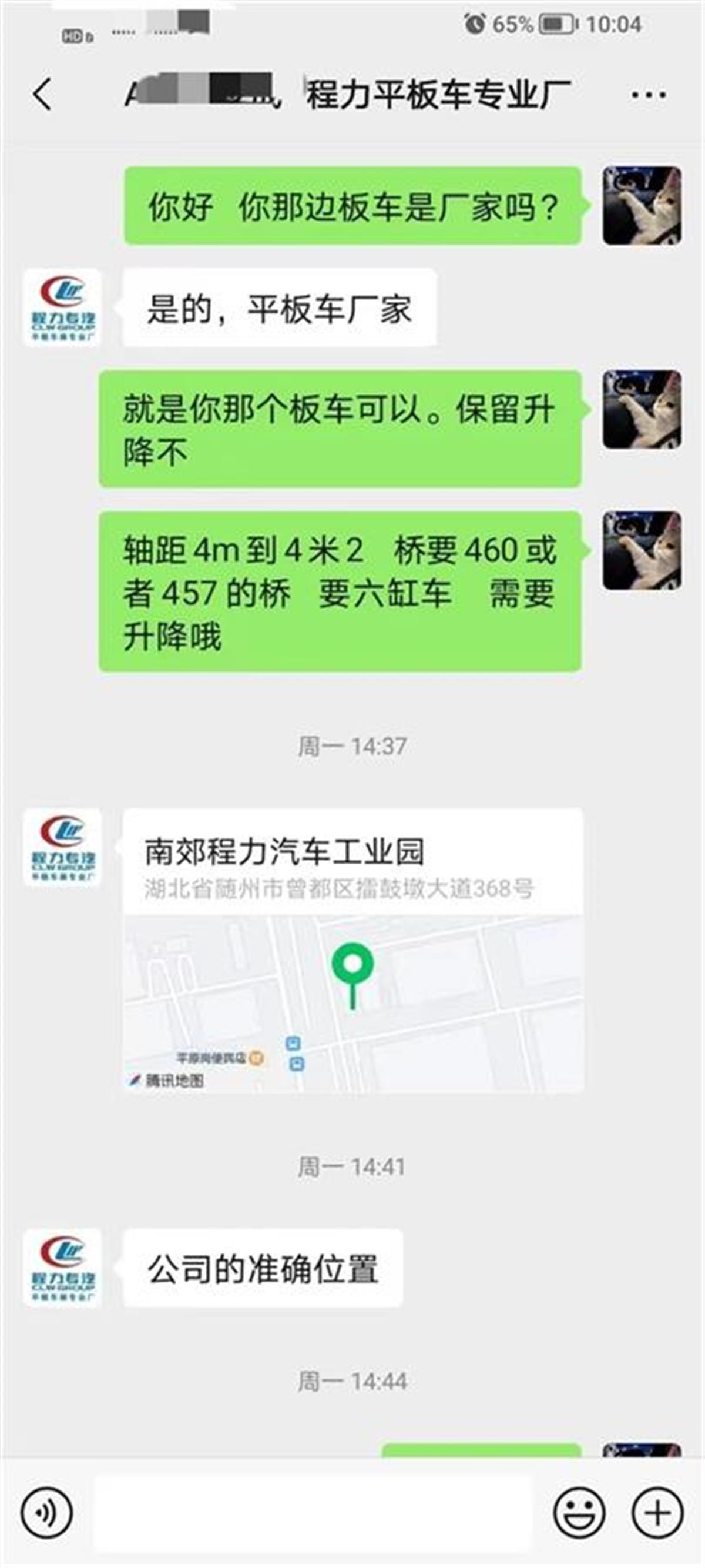 于师傅介绍,2025年3月下旬,他在某视频平台刷到随州程力专汽的平板车广告,便联系到销售人员。