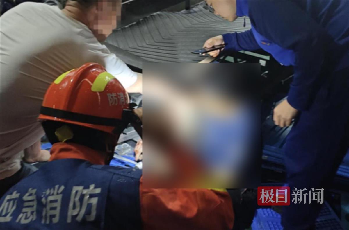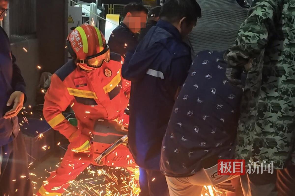 2025年4月11日18时许,消防员到达现场后,发现一名男子半蹲在工厂传送带旁,传送带已经断电,男子上半身紧贴机器,右臂被紧紧卡在滚轴之间,不断有鲜血流出,被卡男子神情虚弱,但意识清醒。工友正用钢架尝试撬动滚轴以减轻压迫。