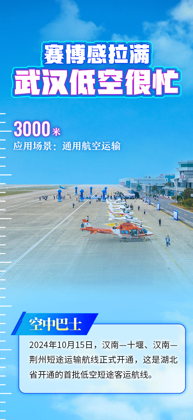 汉南,武汉市民在家门口就能乘坐空中巴士去旅行,一个多小时飞抵十堰武当山机场; 汉口北低空港,载重5吨的无人货运飞机装载着服装箱包升空,只需19分钟就能抵达鄂州花湖机场; 硚口,载着“救命血”的无人机从武汉血液中心飞往武汉亚心总医院,将运输时间缩短至19分钟; 光谷,全国首个低空共享无人机应用示范区的“空中劳模”,天未亮巡检路网,大半夜巡航河湖,深度融入城市治理、公共服务与民生应用,3分钟内就能飞抵任意现场; 新洲,快递“坐”着无人机送到村民手中,家住李镇村的李新朋直呼“太方便”……