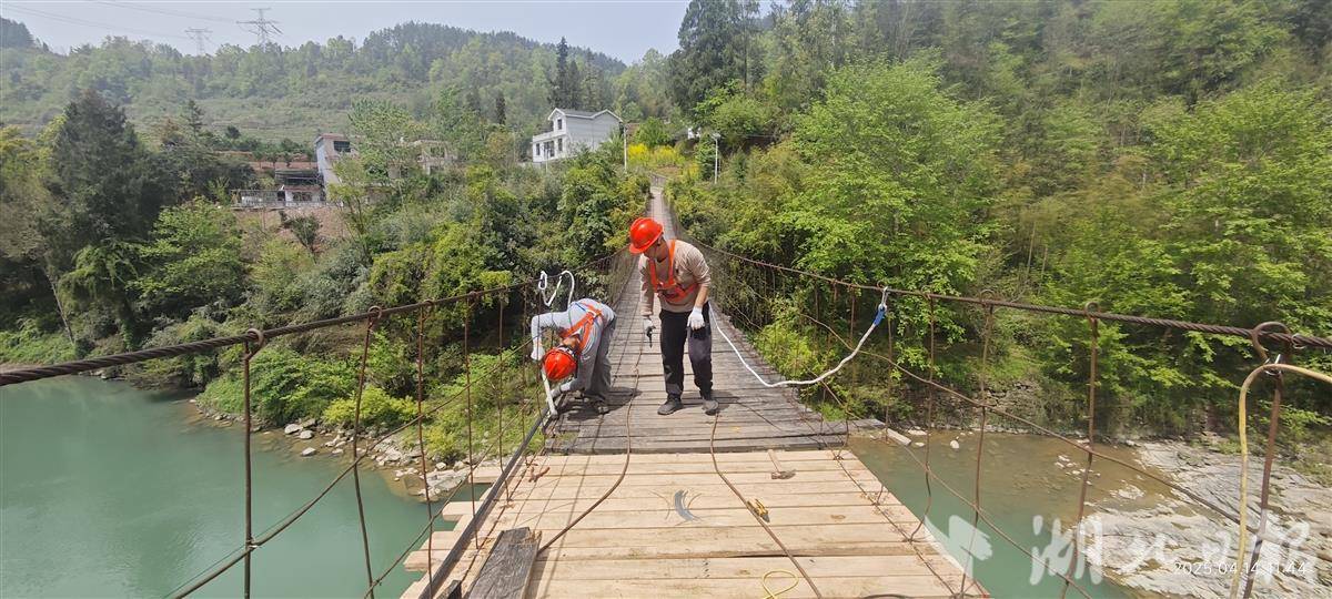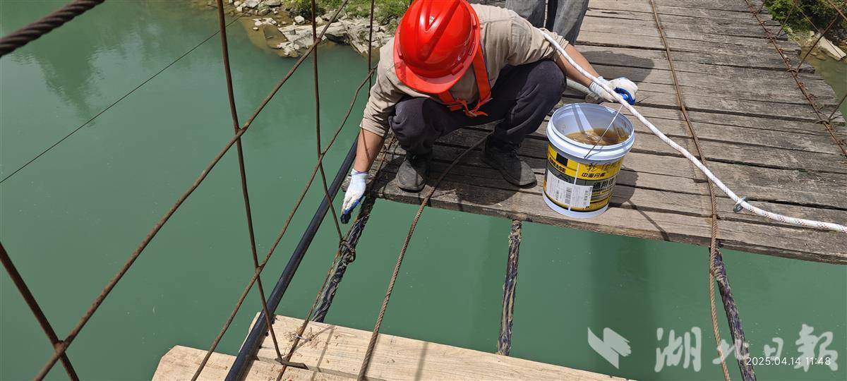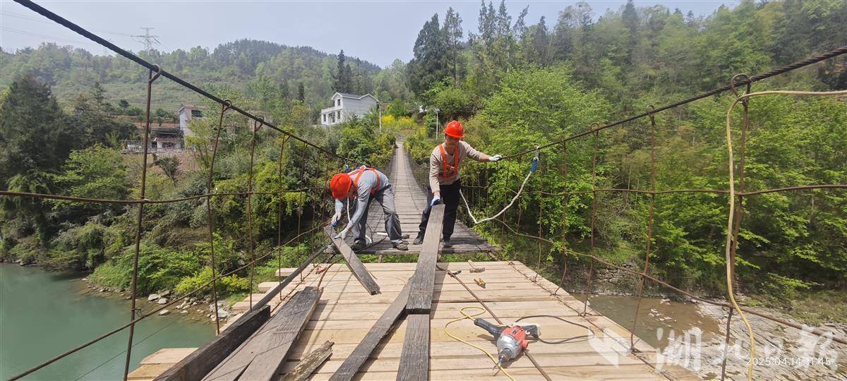 湖北日报讯(通讯员任玉珍、曹征服)4月15日,工人正在位于咸丰县清坪镇团坝子村的钢索桥上施工。