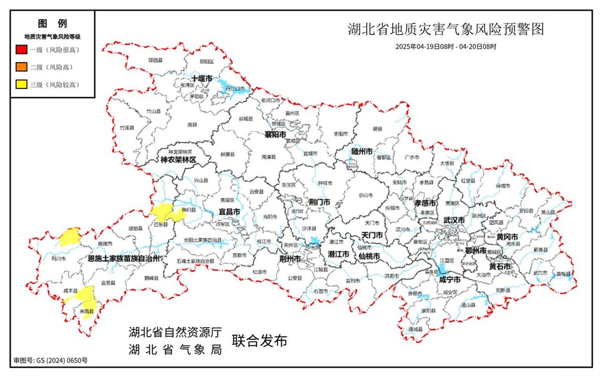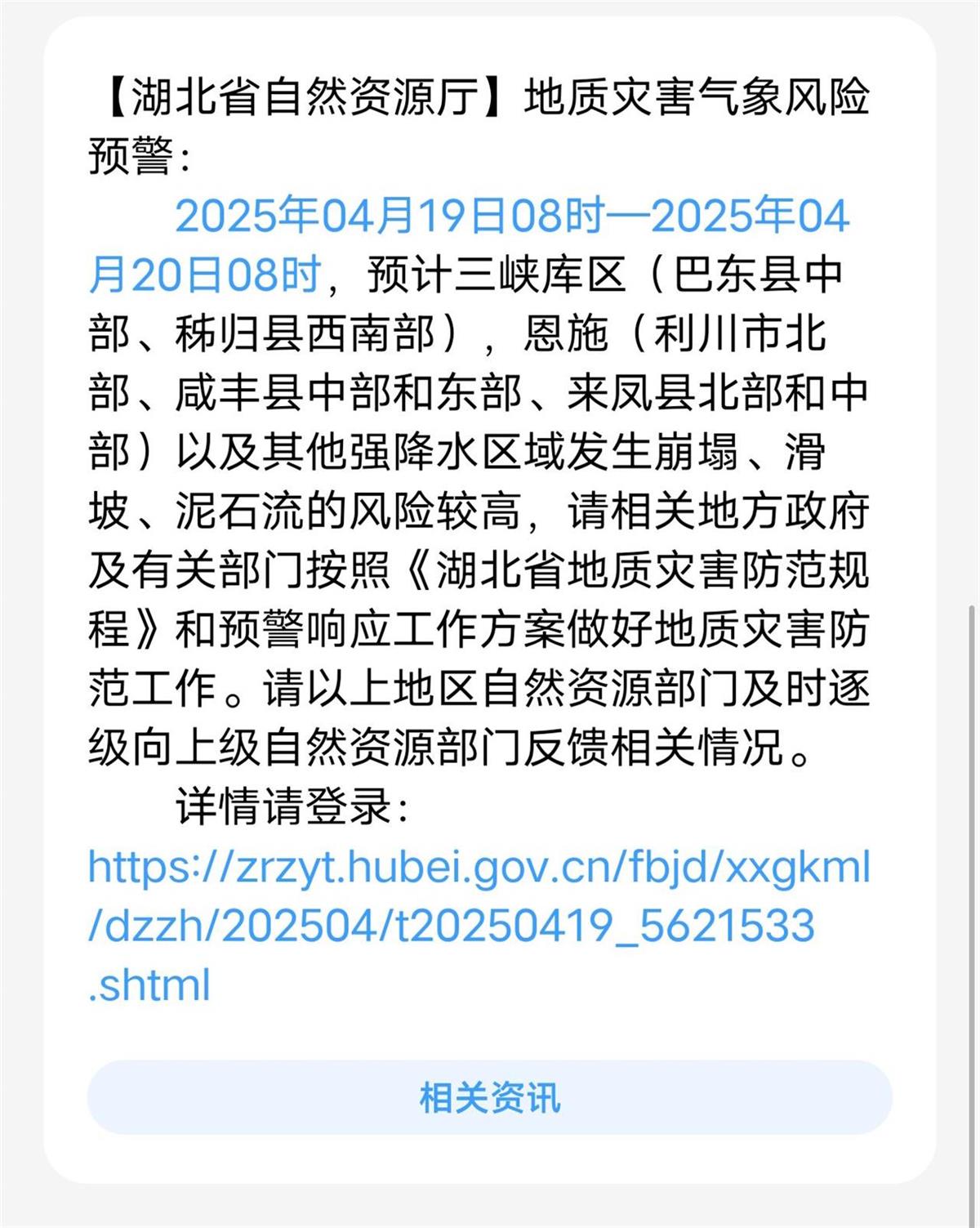 4月19日9时许,湖北省自然资源厅和湖北省气象局联合发布预警:2025年04月19日08时—2025年04月20日08时,预计三峡库区(巴东县中部、秭归县西南部),恩施(利川市北部、咸丰县中部和东部、来凤县北部和中部)以及其他强降水区域发生崩塌、滑坡、泥石流的风险较高,需注意防范!