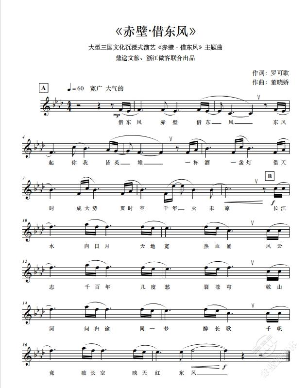 由鼎途文旅、浙江做客文化创意有限公司联合出品的大型三国文化沉浸式演艺《赤壁·借东风》主题曲——《赤壁·借东风》今日正式全球发布。该作品由总导演罗可歌作词,上海音乐学院电子音乐作曲博士,浙江音乐学院青年教师董晓娇作曲,以音乐为媒介,将赤壁之战的恢宏史诗与当代文旅体验深度融合,打造一场跨越千年的视听盛宴。