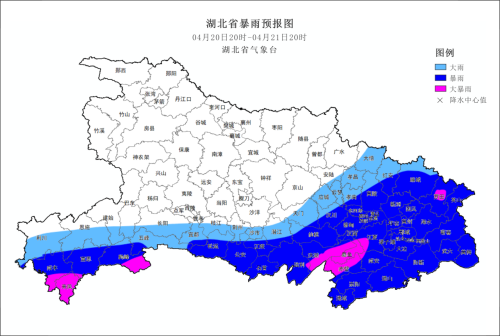 预计20日晚至21日,恩施、宜昌南部、荆州、天门、仙桃、潜江、武汉、孝感、咸宁、鄂州、黄石、黄冈将有大雨到暴雨,其中恩施南部、荆州东部、咸宁、武汉、黄冈局地大暴雨,请注意防范。