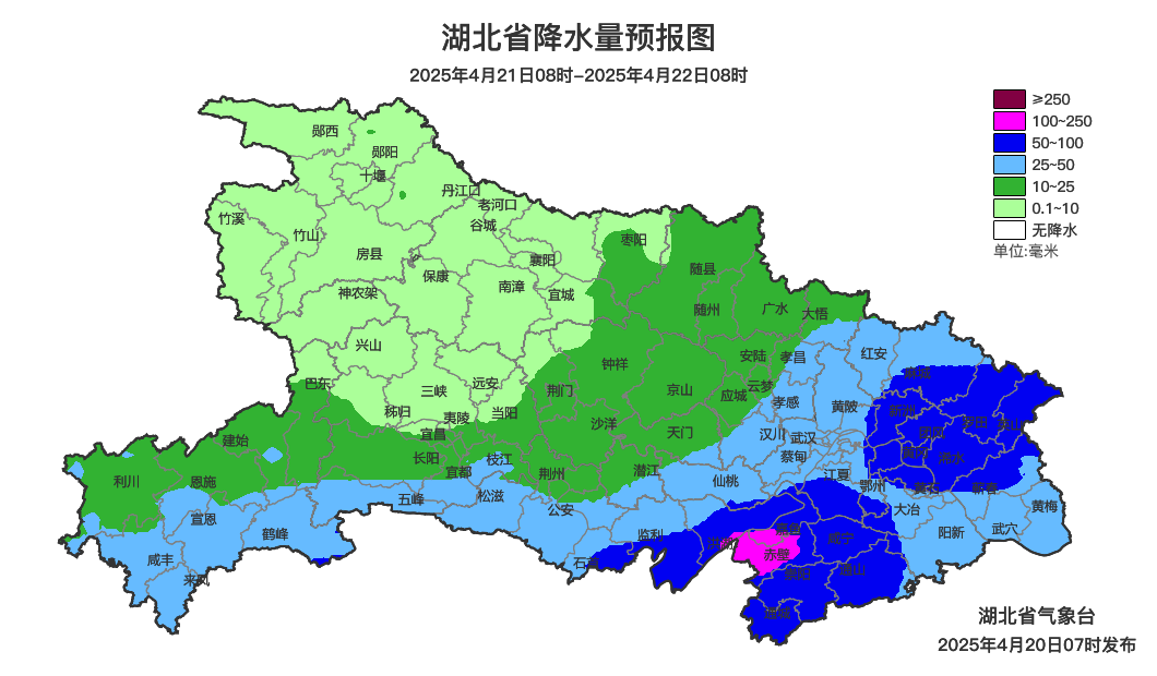 4月21日08时-22日08时,鄂西南中到大雨,局地暴雨;江汉平原南部、鄂东北、鄂东南有大到暴雨,局地大暴雨;其他地区小到中雨,夜间转阴天。省内部分地区伴有短时强降水、雷暴大风、冰雹等强对流天气。最高气温24~30℃,最低气温西部13~18℃、其他地区18~22℃,偏南风转偏北风3到4级、阵风6到8级。