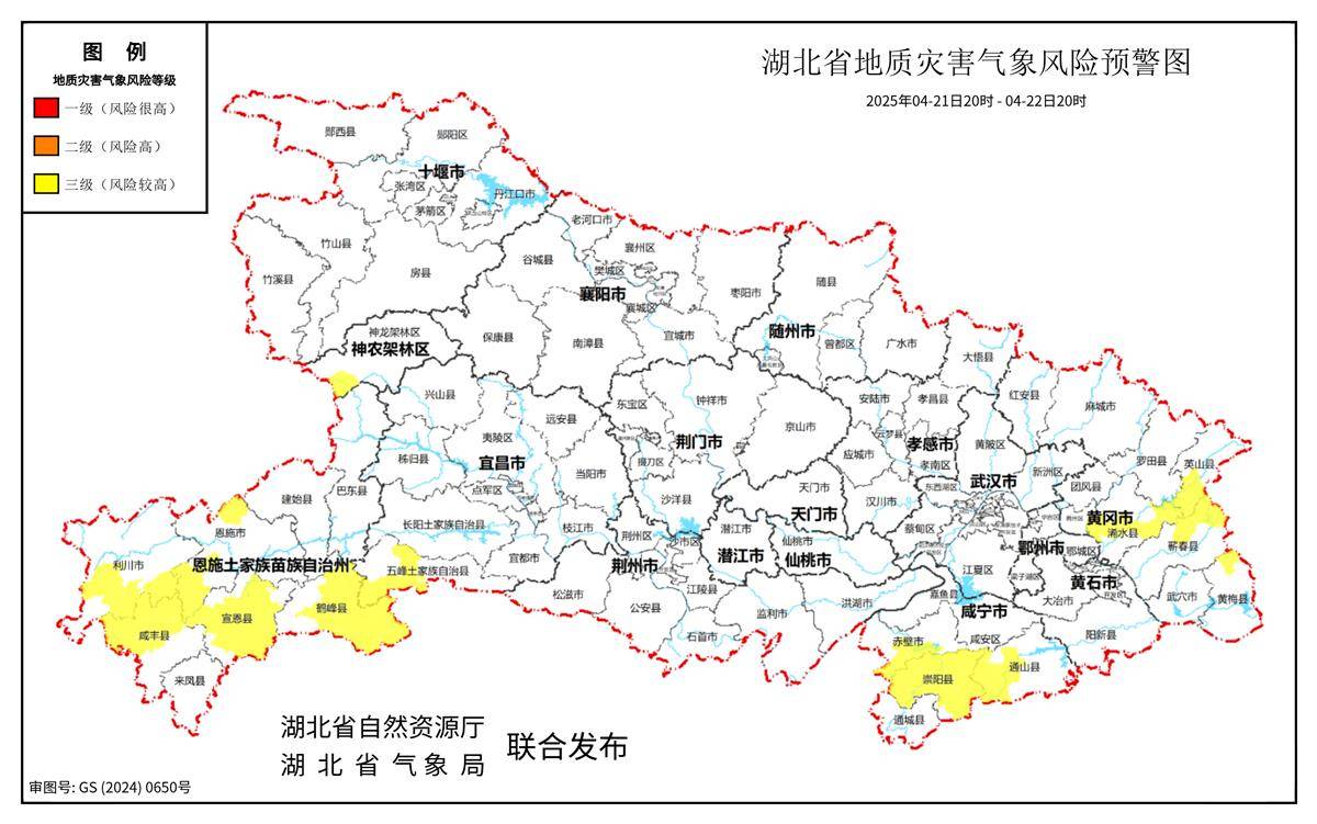 湖北日报讯(记者刘胜、通讯员邵安阳)4月21日下午,省自然资源厅联合省气象局发布地质灾害风险预警。2025年4月21日20时—2025年4月22日20时,预计神农架林区西南部、恩施(恩施市北部和西南部、利川市西部和南部、咸丰县、宣恩县、鹤峰县)、宜昌(五峰土家族自治县西部)、咸宁(赤壁市南部、崇阳县、通山县西部和中部)、黄冈(浠水县中部和东部、英山县南部、蕲春县东北部、黄梅县北部)以及其他强降水区域发生崩塌、滑坡、泥石流的风险较高,需严加防范。