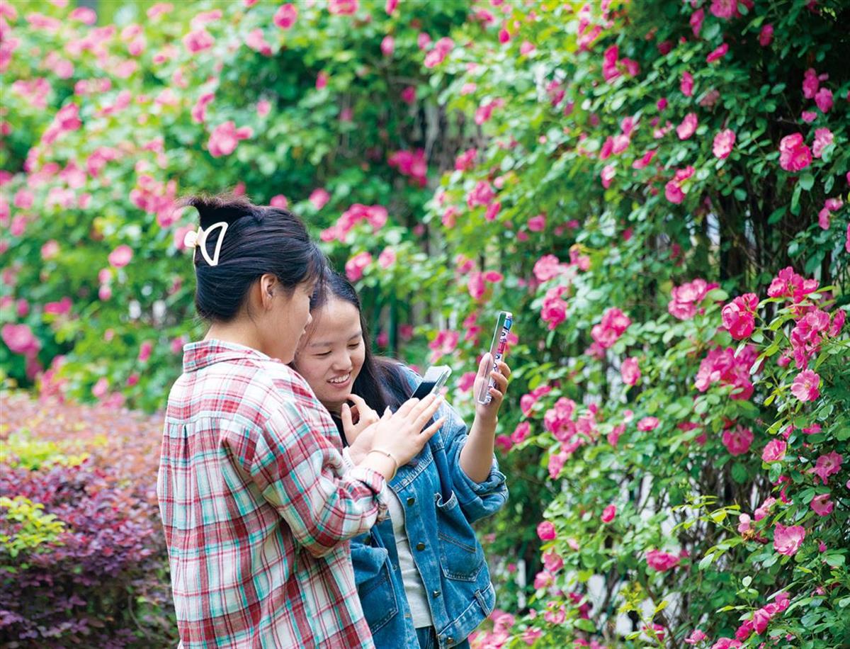 “不光是游客来赏花,我们学校的学生也常在休息时到这里直播。”湖北理工学院一名董姓学生介绍,很多爱美的学生放在休息时间,来这处花墙搞直播。