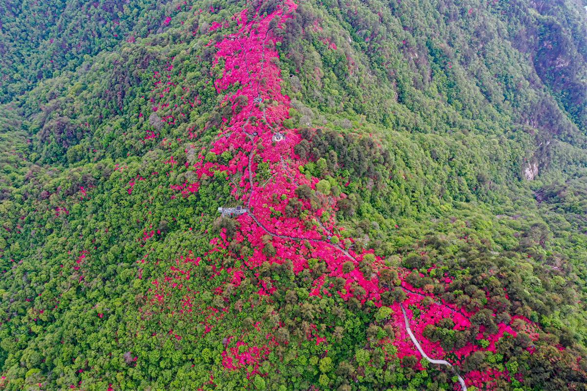 欢迎仪式结束后,30多位网络大V、学者专家、媒体记者乘坐索道登山,游览壮观的杜鹃花海。高山杜鹃竞相开放,一团团、一簇簇,或嫣红似火,或粉若云霞,将整座山峦点缀得如诗如画。漫步于步道之间,两旁的花枝随风轻摇,仿佛在向游人招手。一路上,精彩的国风舞蹈、古乐演奏、模特走秀轮番上演,让游客流连忘返。
