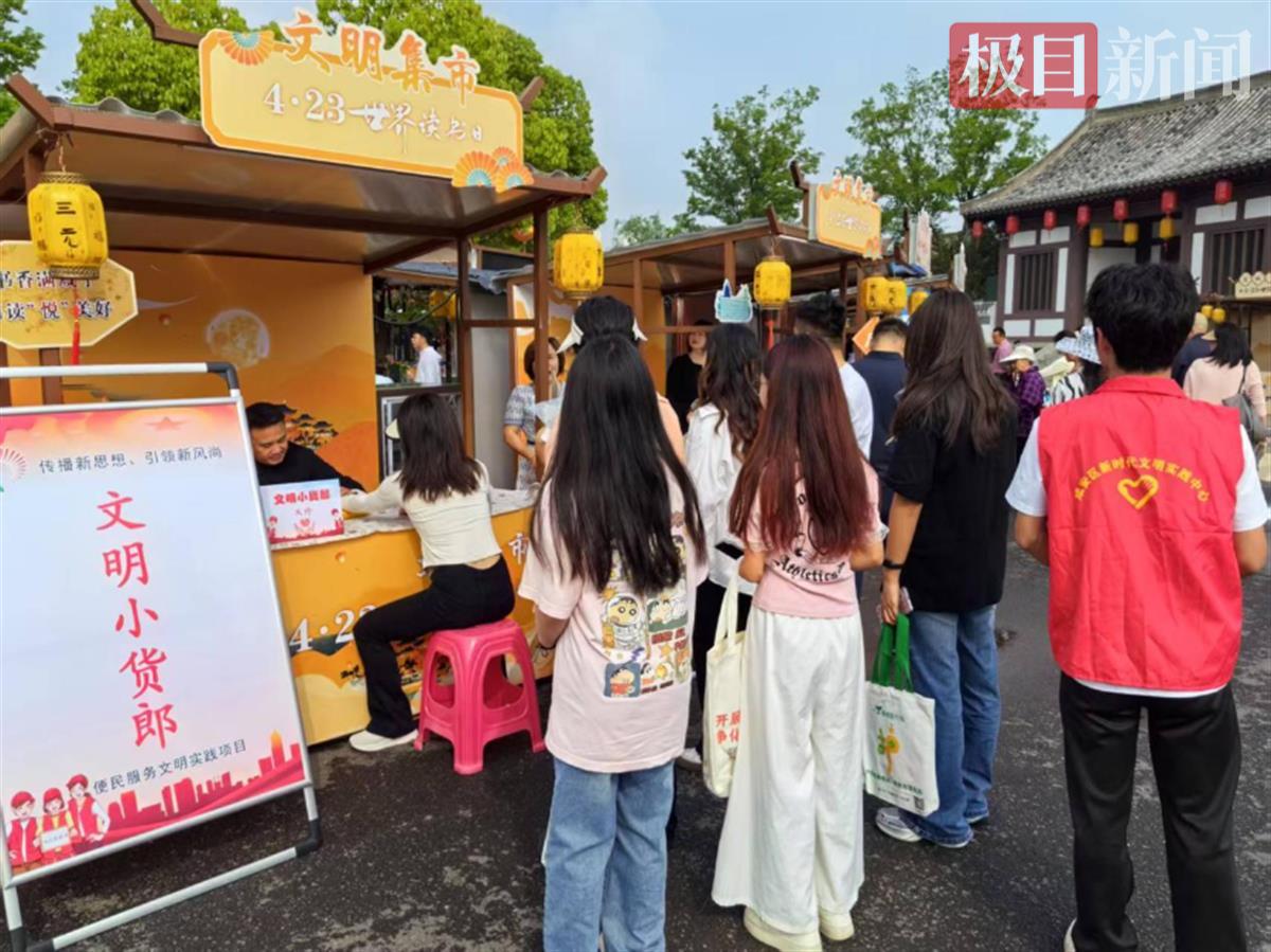 春风拂面,书香满城。4月23日,咸宁市2025年“4·23”世界读书日暨全民阅读主题活动在龙潭里新时代文明实践街区启幕。“文明集市”展区,由咸安区新时代文明实践中心负责的“文明小货郎”服务队以特色便民服务为载体,上演了一场“书香”与“烟火气”的浪漫邂逅,为“书香咸安”建设注入温暖动能。