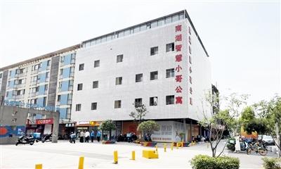 公寓位于武汉市武昌区南湖街道风华天城小区西门旁,曾经是个闲置的售楼部,街道与辖区企业合作盘活,装修后整体出租给饿了么,低价提供给旗下骑手入住。小哥公寓4层楼总面积1200平方米,共27间房,包括单人间、双人间、多人间,单人月租350元至1000多元不等。