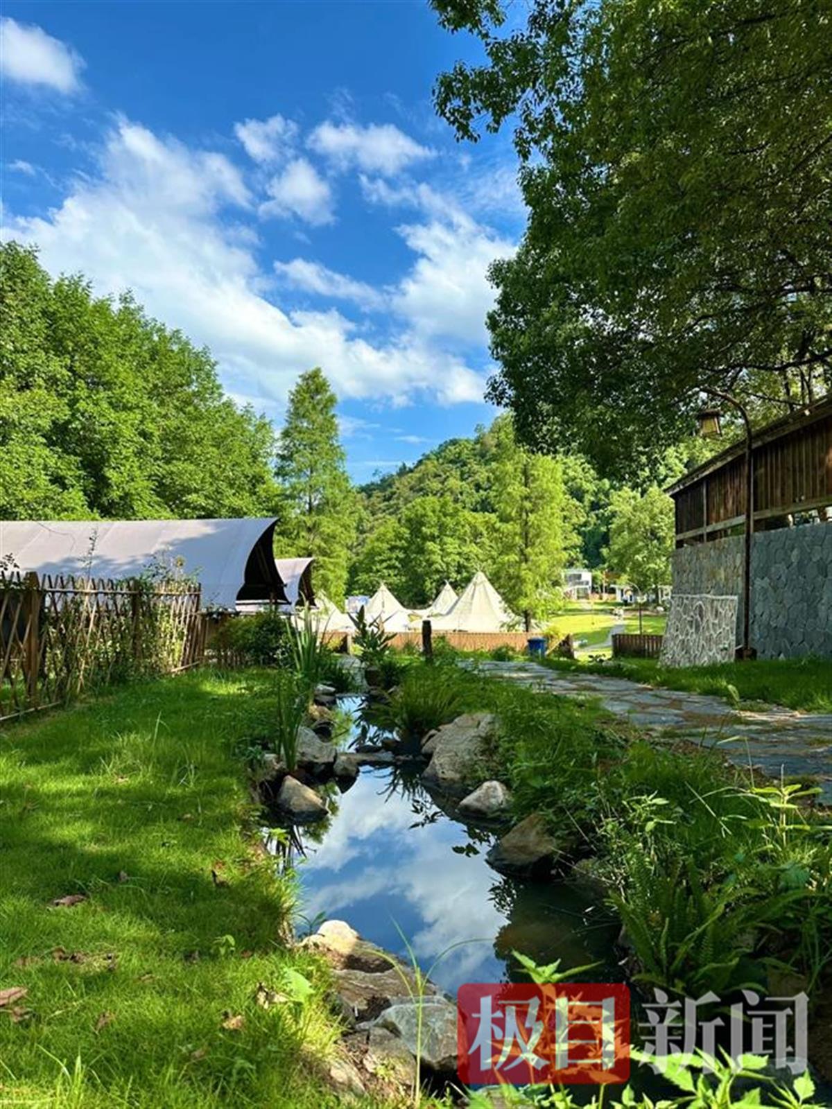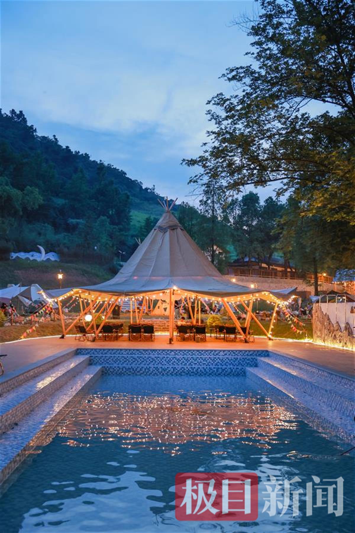 走进月亮湾,宛如走进一个童话的世界:草坪上,一顶顶白色帐篷,四周簇拥着鲜花;山坡上,一栋栋古朴典雅的民宿,深藏在苍松翠柏之中,夜晚在灯光衬托下,显得格外静谧;溪流旁,三三两两的客人,悠闲地喝着咖啡,在窃窃私语。在这里,白天在蓝天白云下闻着花香,听着鸟叫放飞自我;夜晚万籁俱寂,月光下听着虫鸣声入眠……