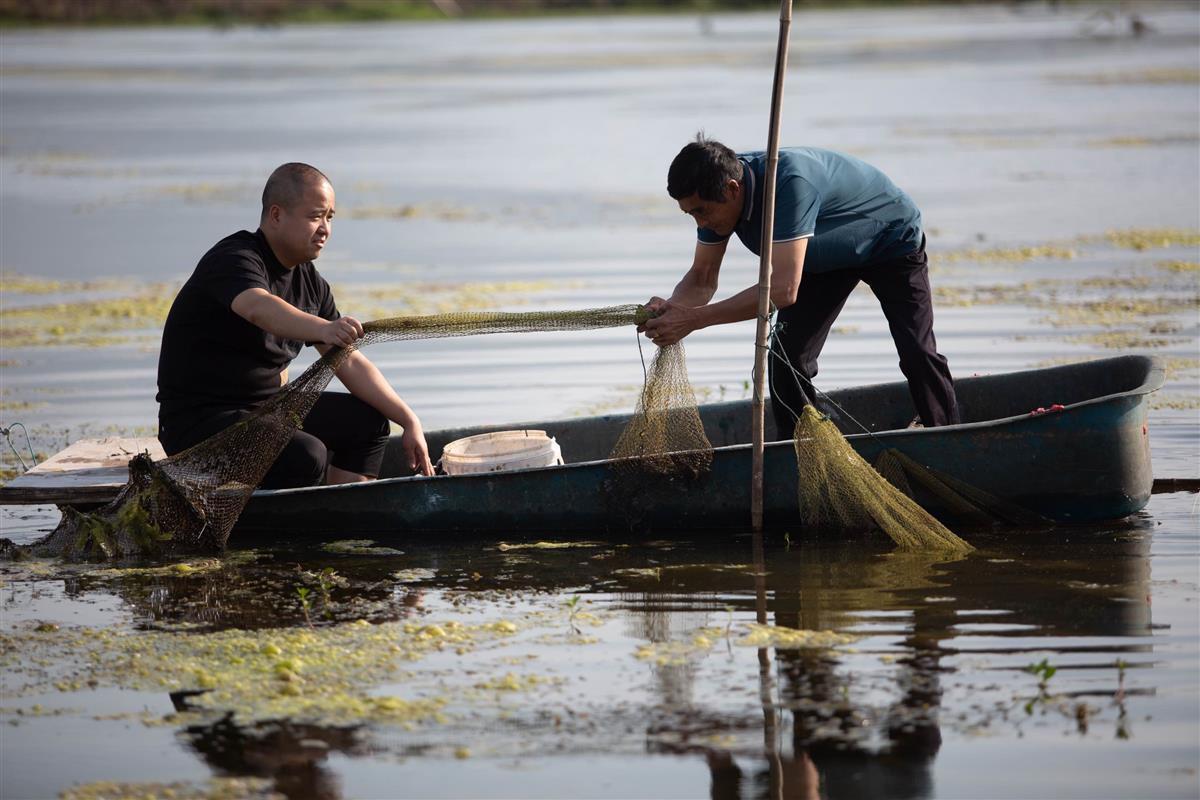 陈俊(左)与养殖户一起在湖中捕虾