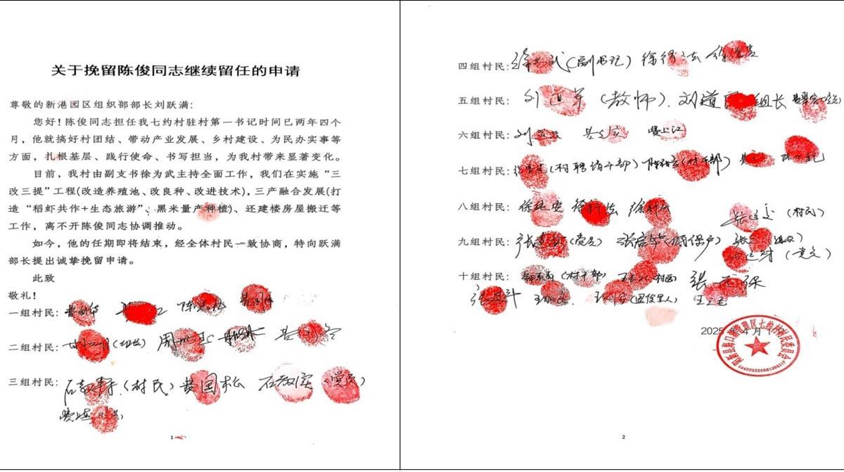 但陈俊在该村任第一书记的任期也到了,村民听说他即将要离开村里后,七约村10个小组、42名村民联名请愿,要求留下这名“能做事”的陈书记。七约村副书记徐为武介绍,宰相刘罗锅主题曲《清官谣》中,有句经典的台词“天地之间有杆秤,那秤砣是老百姓”。徐为武说,陈俊在七约村一心为民地付出,村民心里照样也有杆秤。