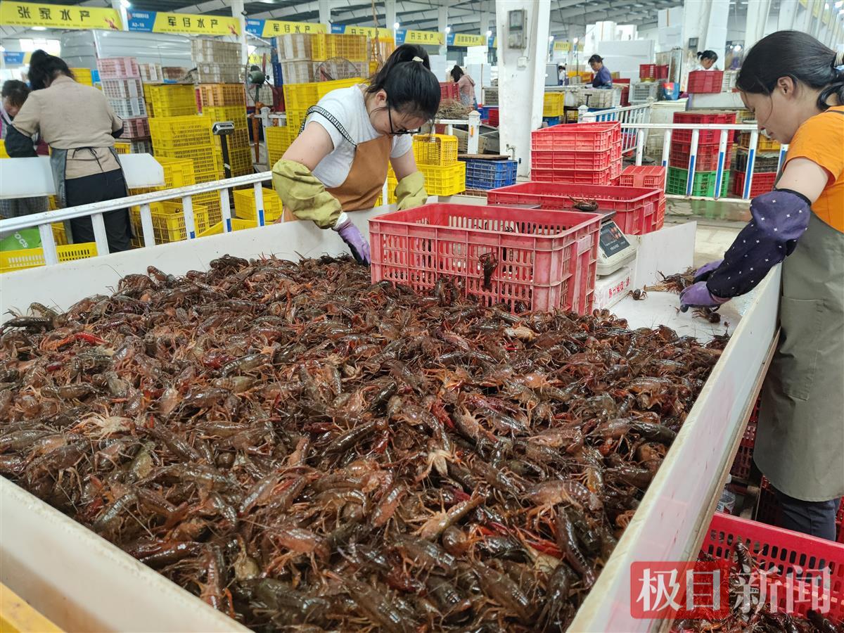 当日上午11时许,虾谷里仍是一派忙碌,交易声、打包声、引擎声汇成一片红火的江湖。从凌晨4时起,这里就已灯火通明,开始交易。各档口里,商户们一边接电话,一边开单算账;分虾工们指尖翻飞,将小龙虾按个头分类,分装入筐;工人们将分拣好的虾倒入统一规格的泡沫箱,加冰封箱。这些包装好的龙虾就会在4至14小时内,奔向全国600余个城市。