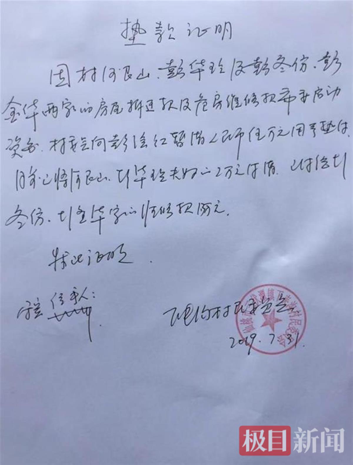 彭绘红告诉记者,他是仙桃市三伏潭镇下夹沟的村民。6年前,村委会找到他表示,村里申请房屋拆迁及改造的资金迟迟没有下来,但事情迫在眉睫,于是便向他借款了5万元用于房屋重建,村委会也给他开具了盖有村委会公章的垫款证明。彭绘红手中还留存着自己给村里的转账记录。