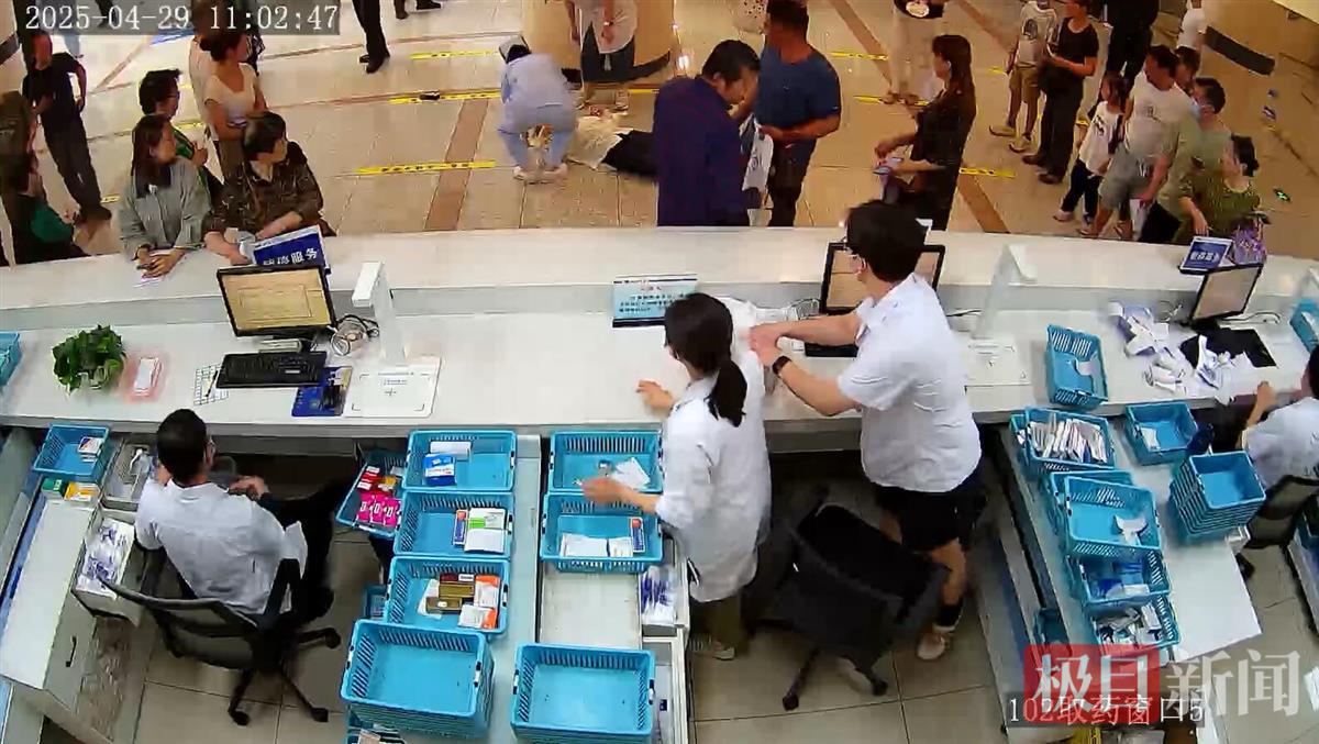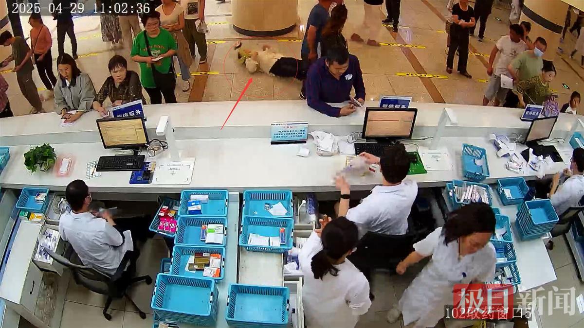 时间回到4月29日上午,根据院方的监控视频显示,当天11时02分35秒,一名女子在该院门诊一楼的药房窗口排队取药过程中,突发意识丧失,倒地不起。