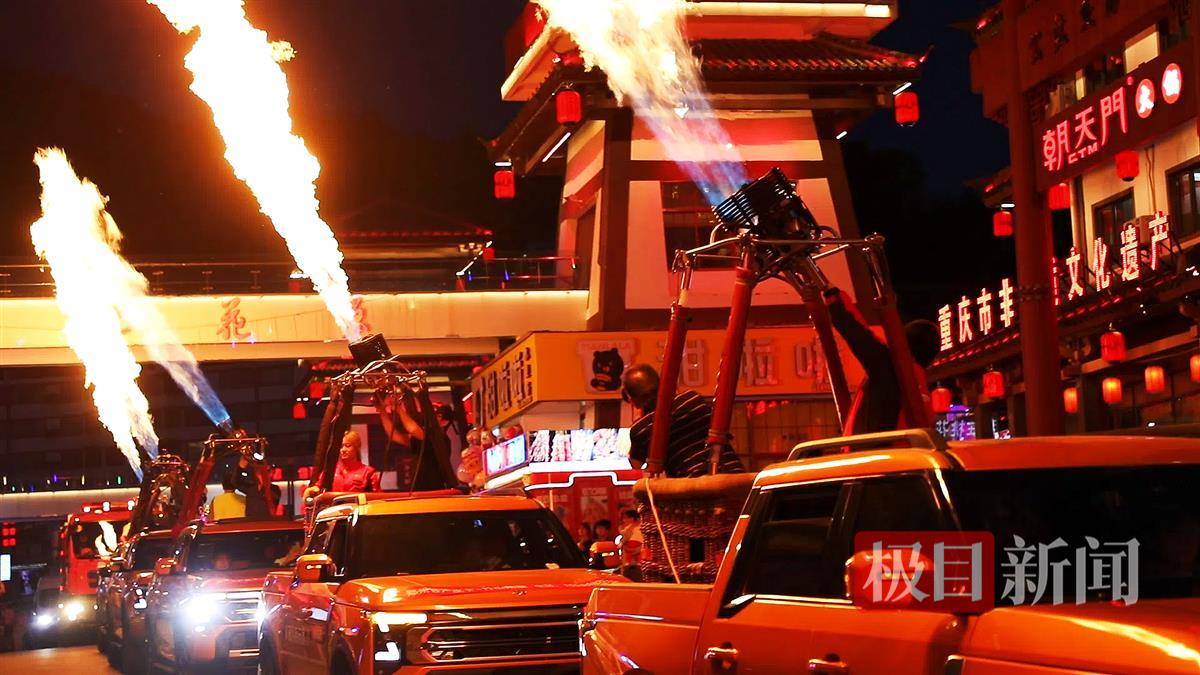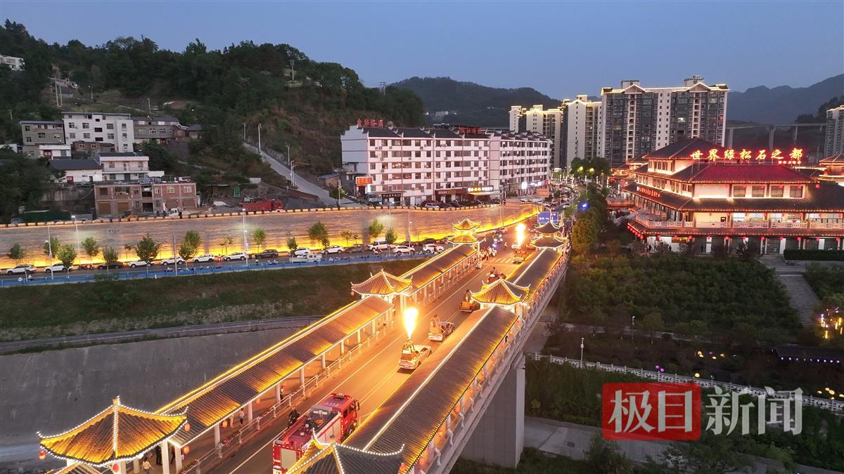 当晚7时30分,由7台皮卡车搭载热能装置的巡游车队自女娲广场启程。经特殊改装的喷火装置同步喷射3米高的焰柱,流动的”火龙”沿着堵河蜿蜒6公里,跃动的火舌与粼粼波光交相辉映,在明清古建筑群幕墙上投射出奇幻光影。巡游队伍途经纵横大道、堵河廊桥等核心景观带时,喷射系统精准调控形成波浪式焰火阵列,引发沿途观众阵阵惊叹,百余部手机瞬时点亮拍摄光海。