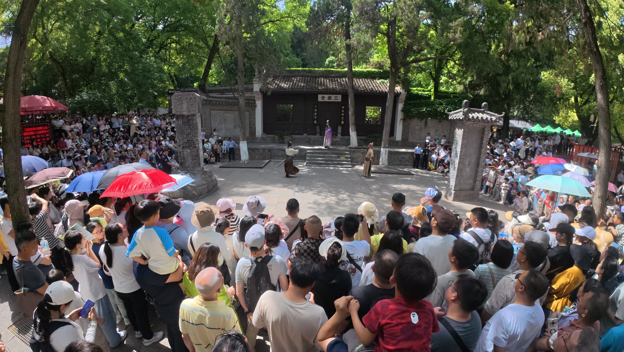 “三顾茅庐”的典故在古隆中景区被科技赋予新生命。五一期间,该景区以“遇见诸葛亮”为主题,推出《三顾茅庐》情景短剧,游客可化身“刘备”参与剧情互动;“劳动者”系列人形机器人亮相,在三顾堂前与游客举重比拼;AI穿越相机则让游客一键生成羽扇纶巾的三国剧照,历史场景秒变“打卡现场”。