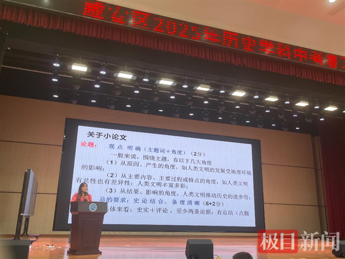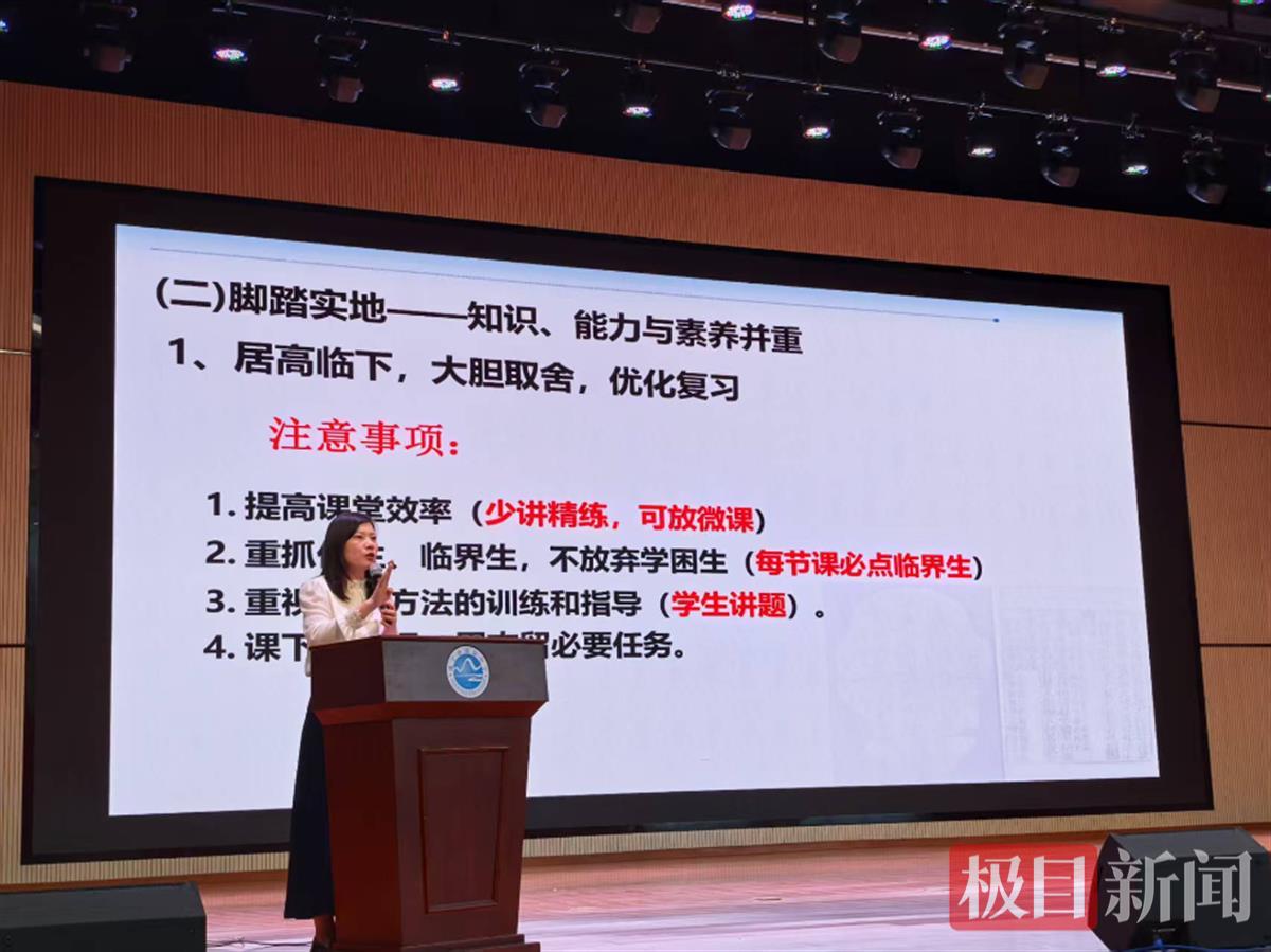 咸宁市实验外国语学校历史教研组长彭苹分享了《明方向,夯基础,巧方法》的备考经验,指出教师在备考过程中要立足教研,明确备考的方向,依托课本,夯实基础,并结合一线教学实践讲述了小论文的备考方法和中考备考策略。她还分享了采用形式多样的激励措施,调动学生的学习积极性,达到事半功倍的效果,既从宏观上指明了备考方向,又给予了具体细致的备考方法,与会教师收获颇多。