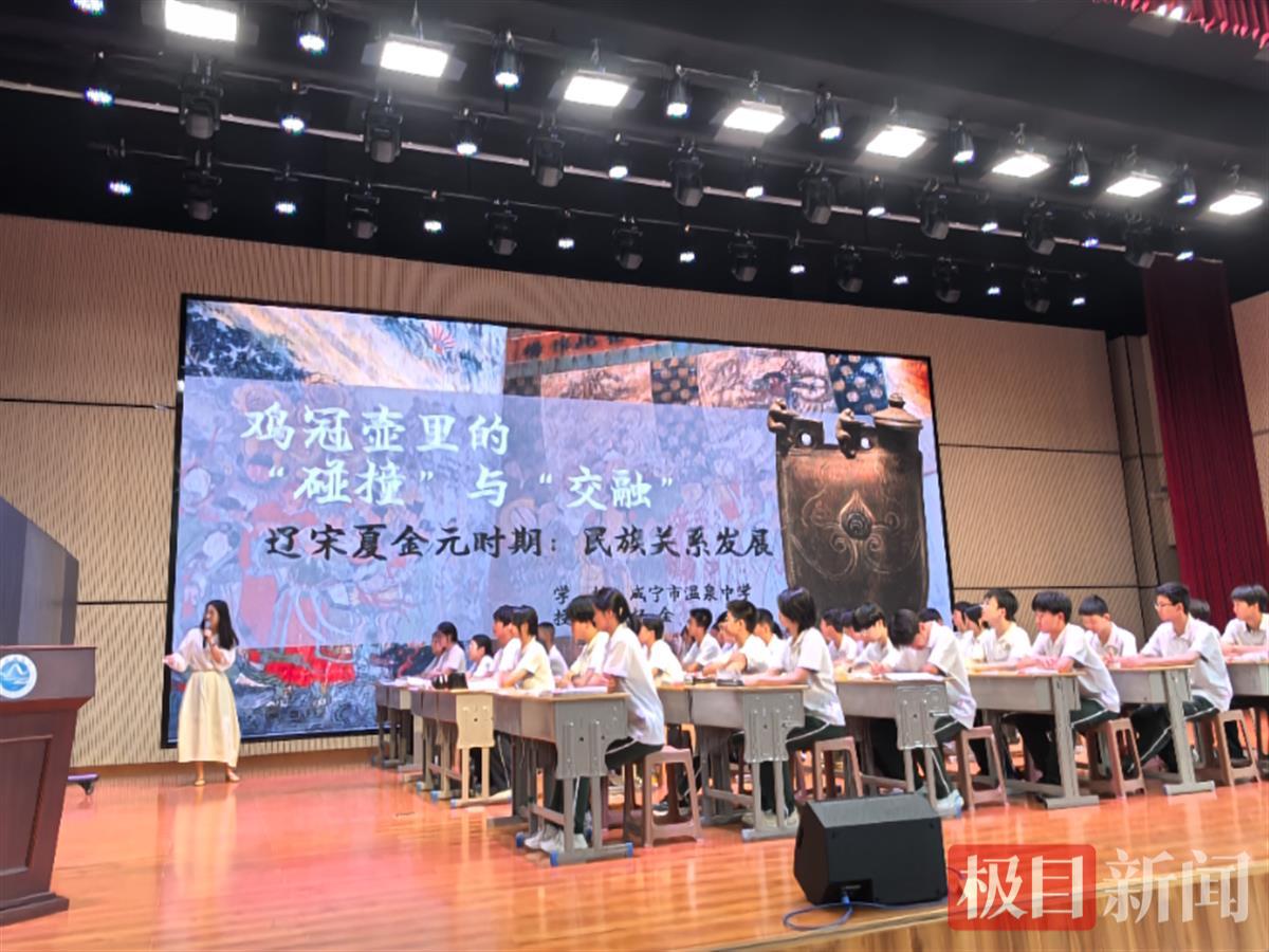随后,咸宁市温泉中学杨金老师讲授《鸡冠壶里的碰撞与交流——辽宋夏金元时期的民族关系发展》复习课。课程以“鸡冠壶 ”为线索探讨辽宋夏金元时期在统一多民族国家发展中所起的作用。课程围绕中国历史政权更迭展开,结合地图分析、材料阅读等任务,帮助学生理解民族融合与政治制度变迁的关系,充分体现历史学科核心素养要求。教学中设计“文物大侦探 ”“文物鉴赏家 ”等活动,引导学生通过分析材料(如鸡冠壶的隐喻、元朝文化政策等)自主归纳历史特征,培养史料实证能力,并结合示意图、地图等工具,直观呈现政权更迭的时空变化(如“辽与北宋、西夏政权并立 ”“金灭辽 ”),增强学生的时空观念。
