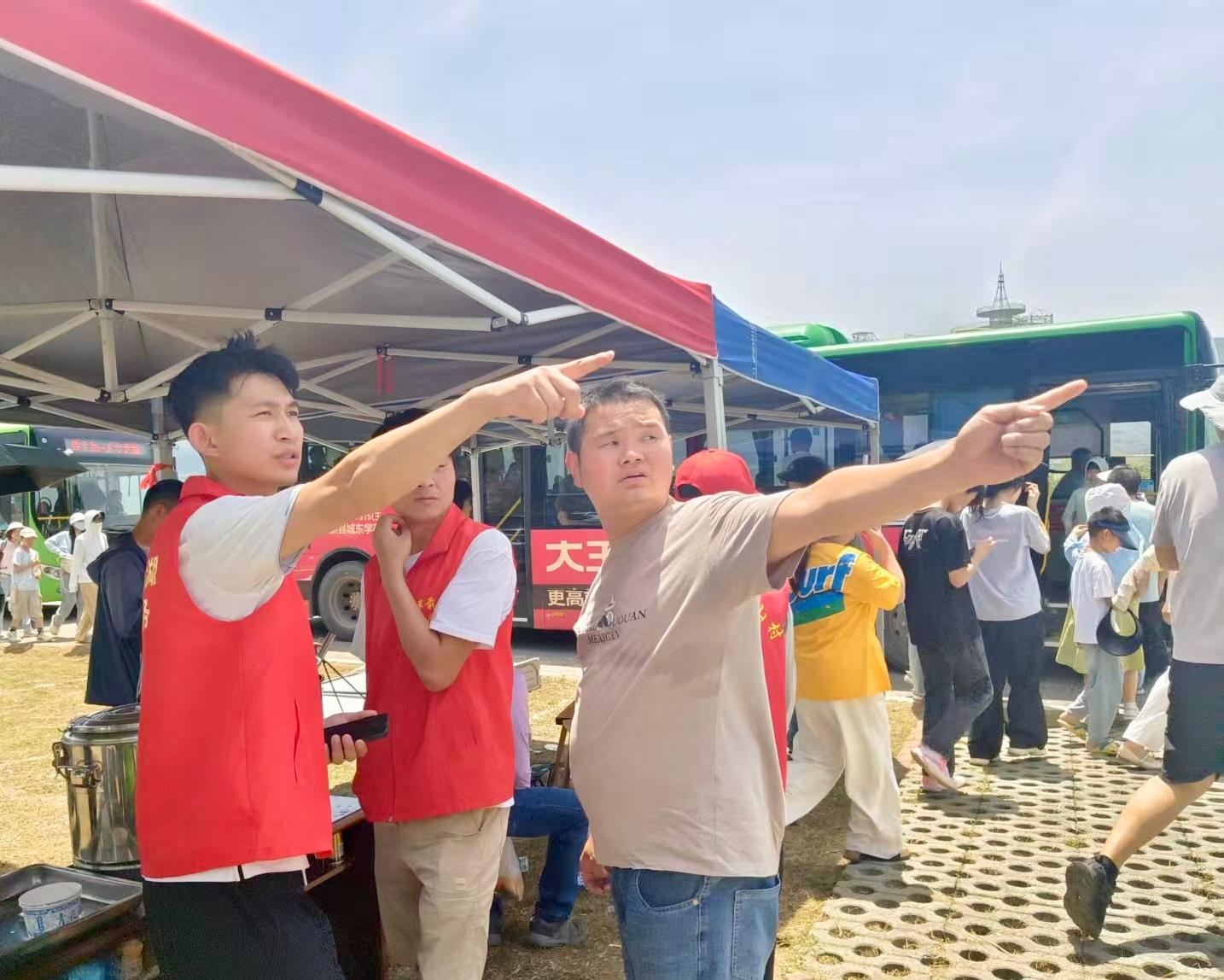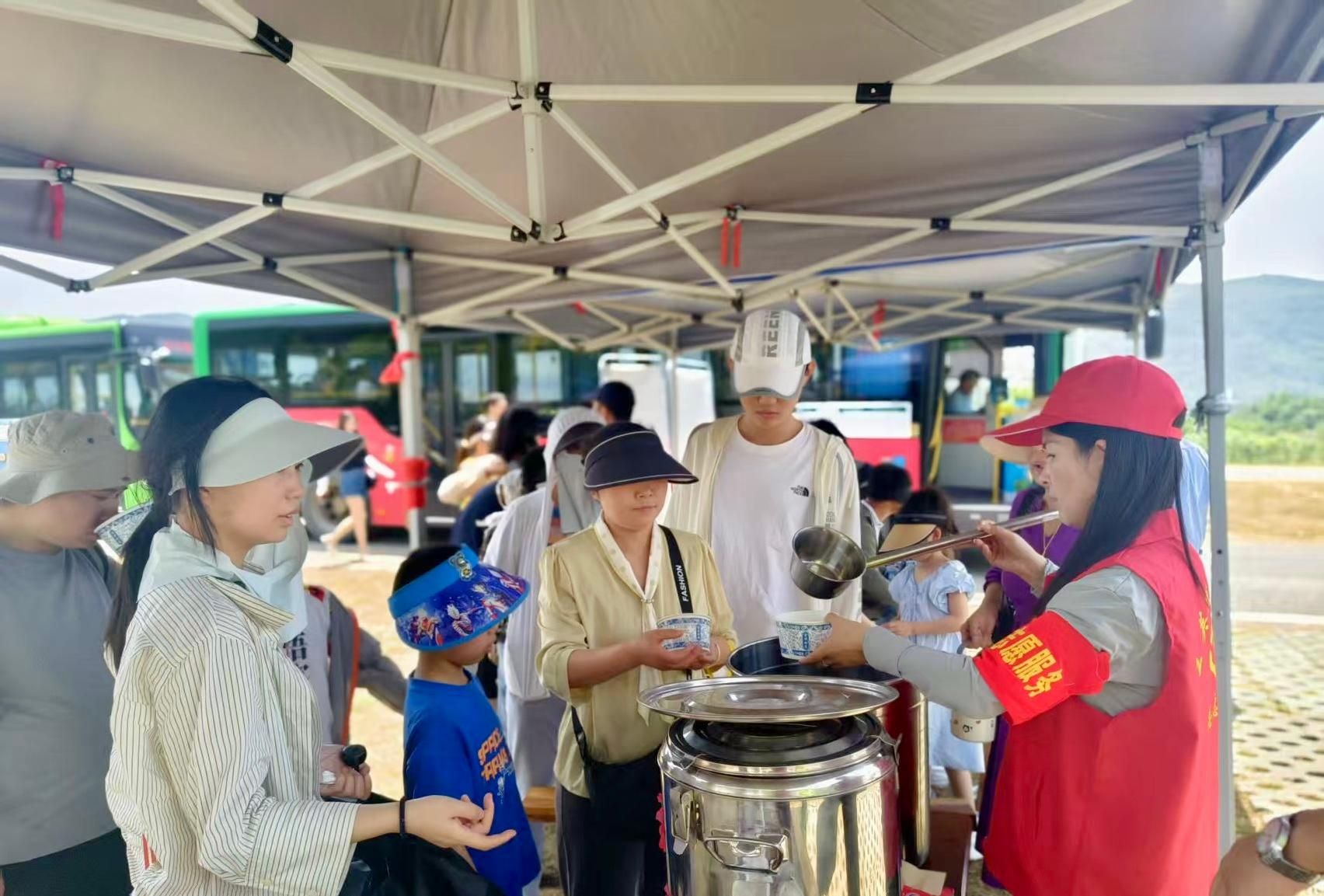在停车场内的便民服务点,不锈钢保温桶里的绿豆汤正冒着丝丝凉气。“这是我们今天自己熬制的绿豆汤,天气炎热,大家多喝一点。”志愿者吴杜娟边为游客递上一次性纸碗边介绍道。