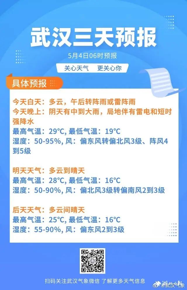 另据武汉气象消息,4日傍晚至夜间,武汉有一次降水天气过程,局地伴有雷暴大风等强对流天气。