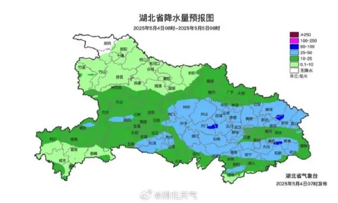 5月4日08时-5日08时,鄂西南阴天有小到中雨,局地大 雨;江汉平原、鄂东北、鄂东南阵雨转中到大雨,局地暴雨; 鄂西北多云转小到中雨。省内局地伴有雷电和短时强降水等 强对流天气,部分地区有雨雾。最高气温西部18~23℃、中东部24~30℃,最低气温西部14~16℃、中东部16~20℃, 偏东风转偏北风3级、阵风4到5级。