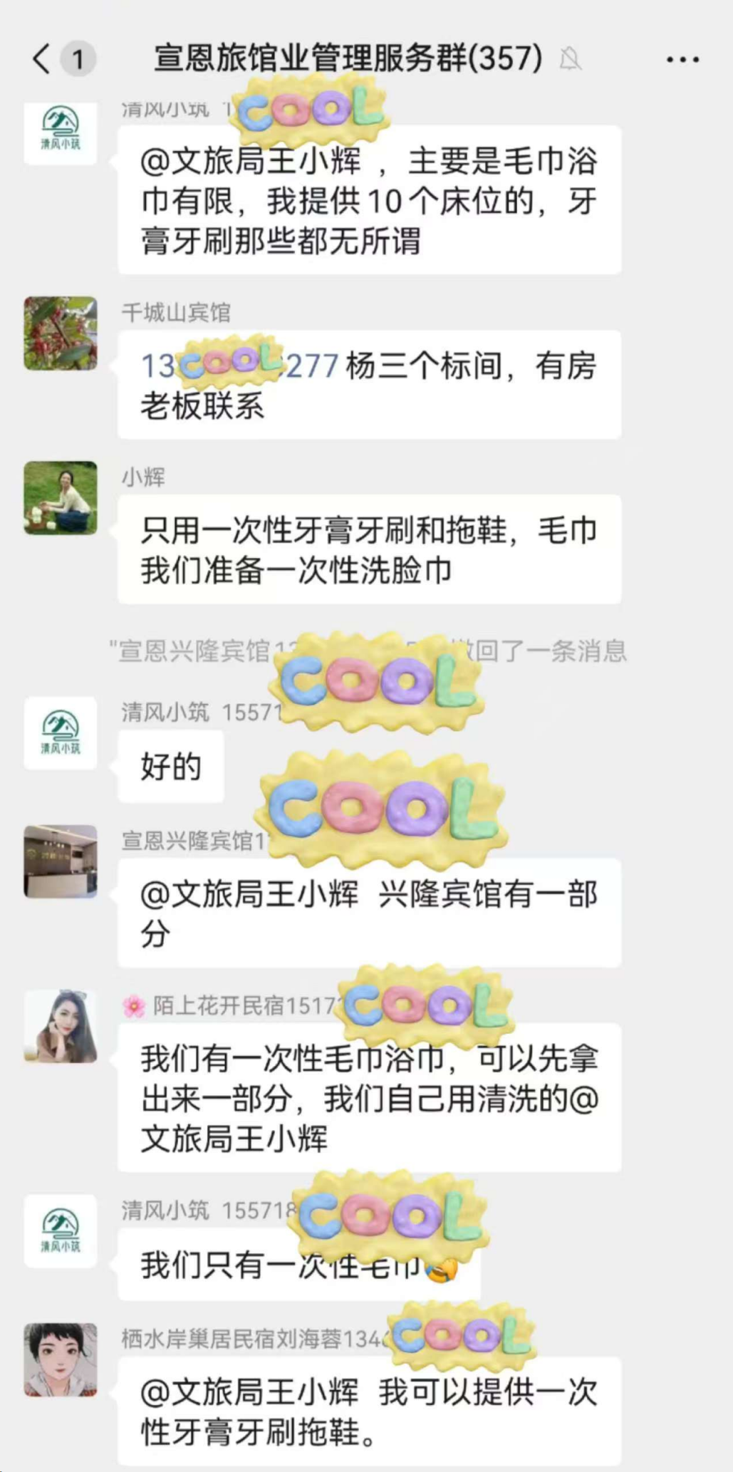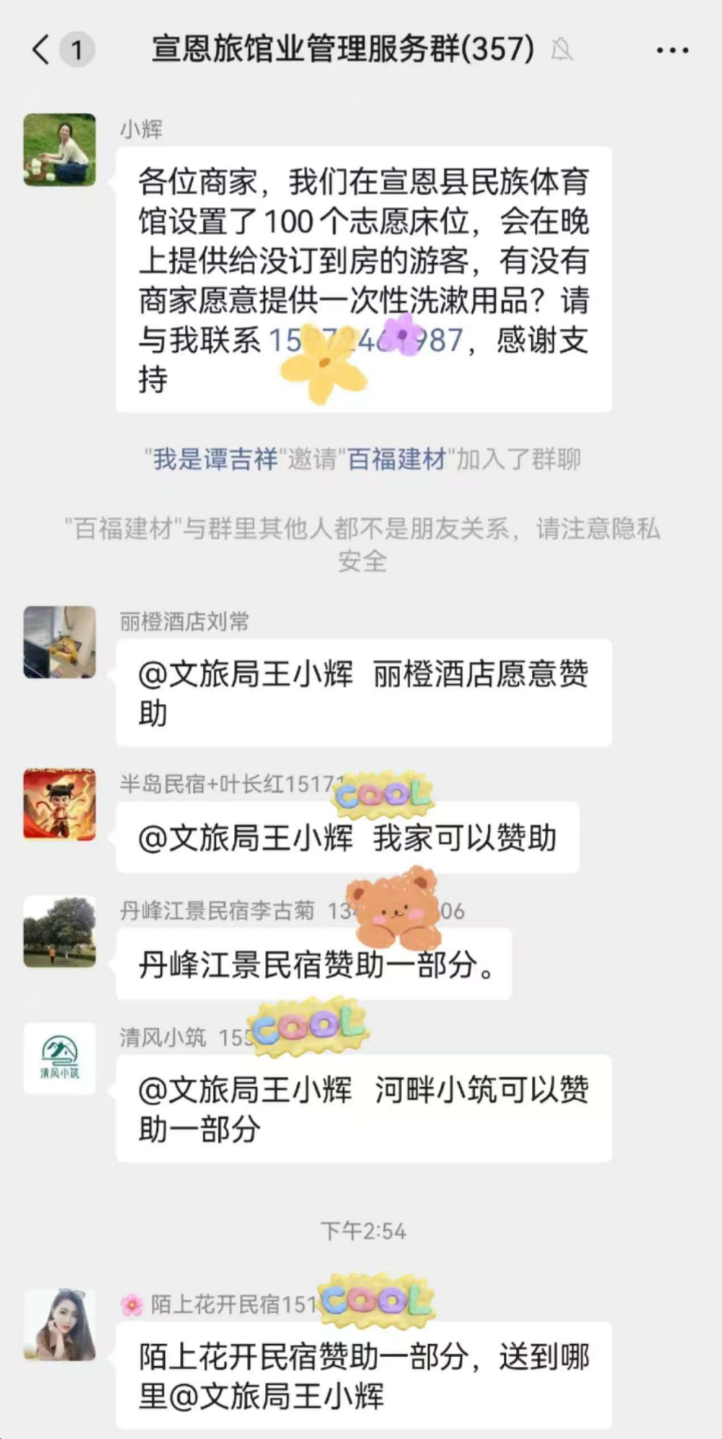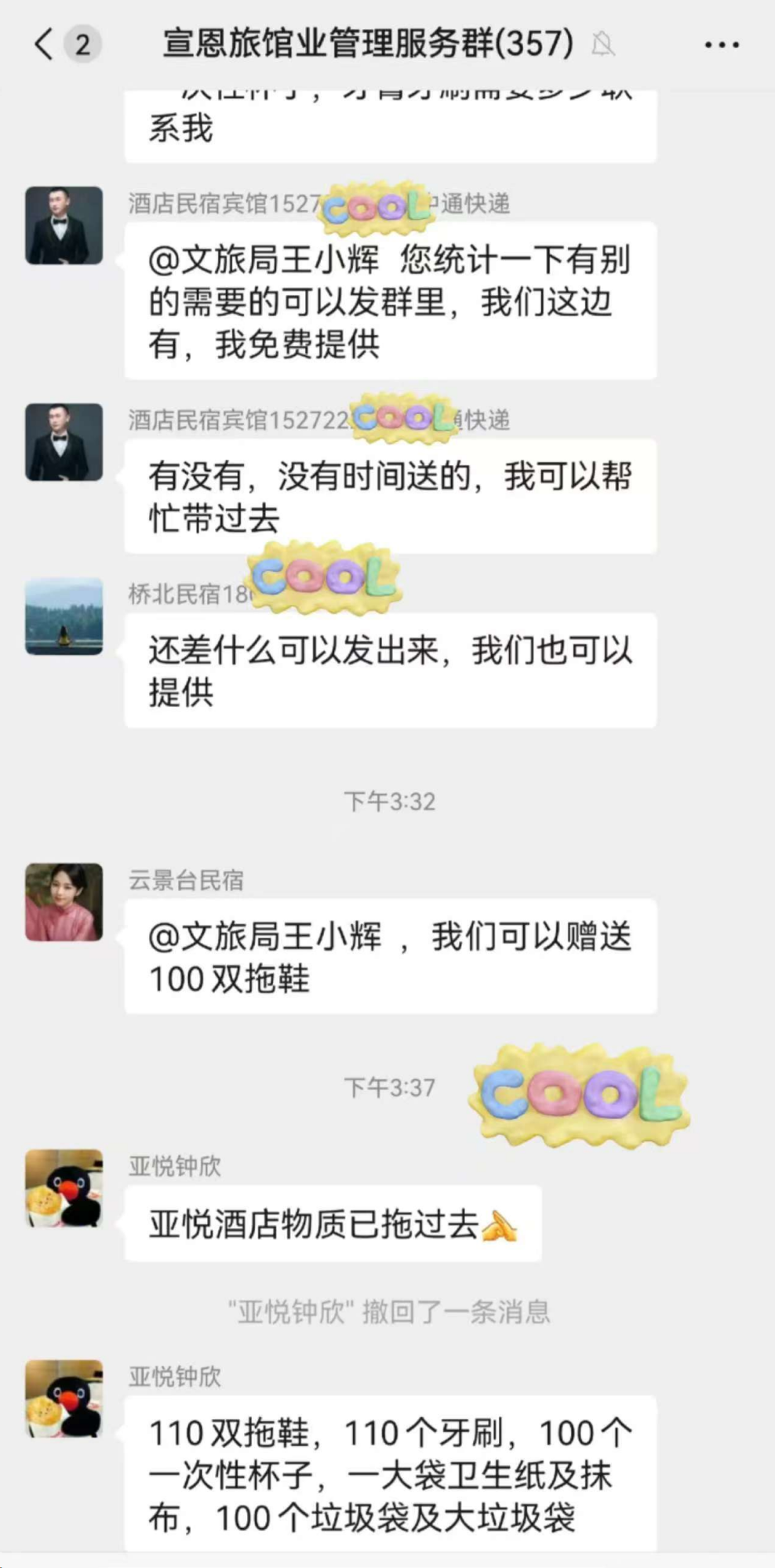 俗话说,人多力量大。面对游客的应急需求,宣恩文旅局决定发动社会力量。5月3日上午,文旅局工作人员王小辉在当地旅游交流群发出物资征集信息后,立即获得热烈响应——“我家可以赞助”“丽橙酒店愿意赞助”“我可以提供一次性牙膏牙刷拖鞋”“我们有一次性毛巾浴巾,可以先拿出来一部分”……