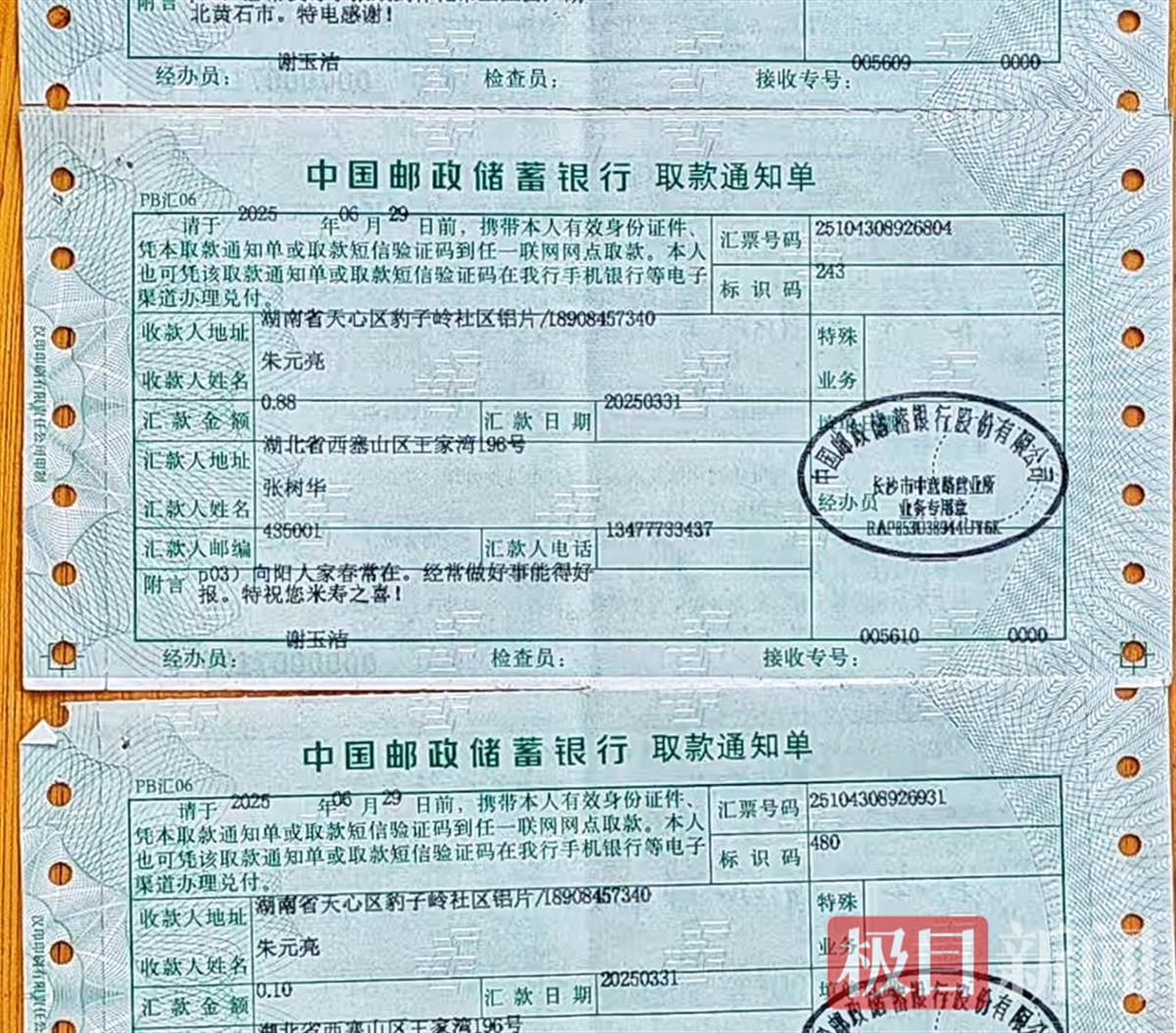 写有祝福语的汇款单(受访者供图)