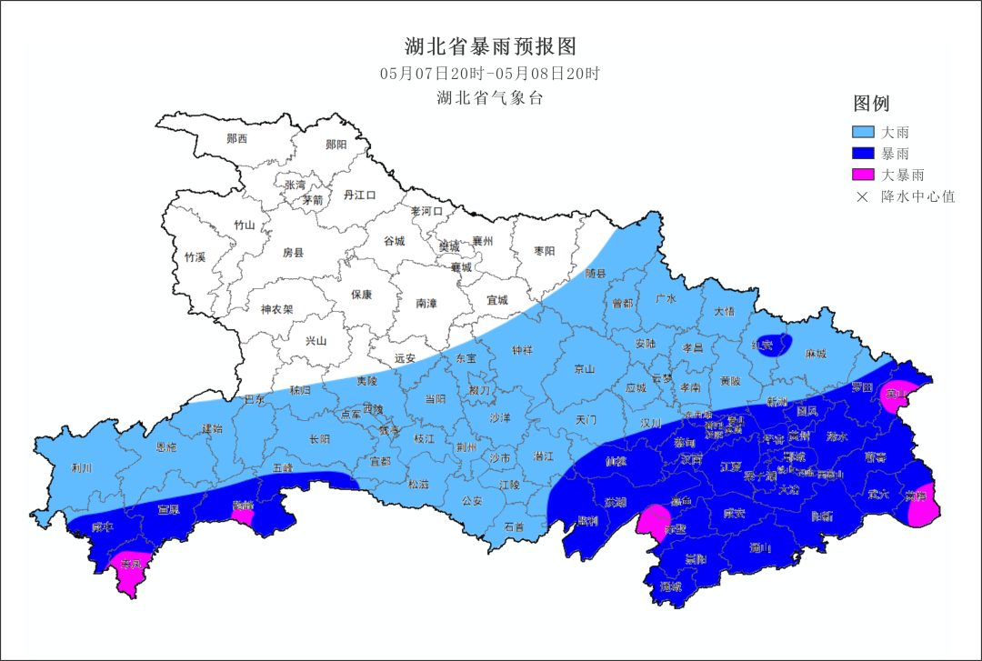 预计7日晚上至8日白天,恩施、宜昌南部、荆州、天门、仙桃、潜江、孝感、武汉、鄂州、黄冈、黄石、咸宁将有大雨到暴雨,其中恩施南部、咸宁、黄冈局地大暴雨,请注意防范。
