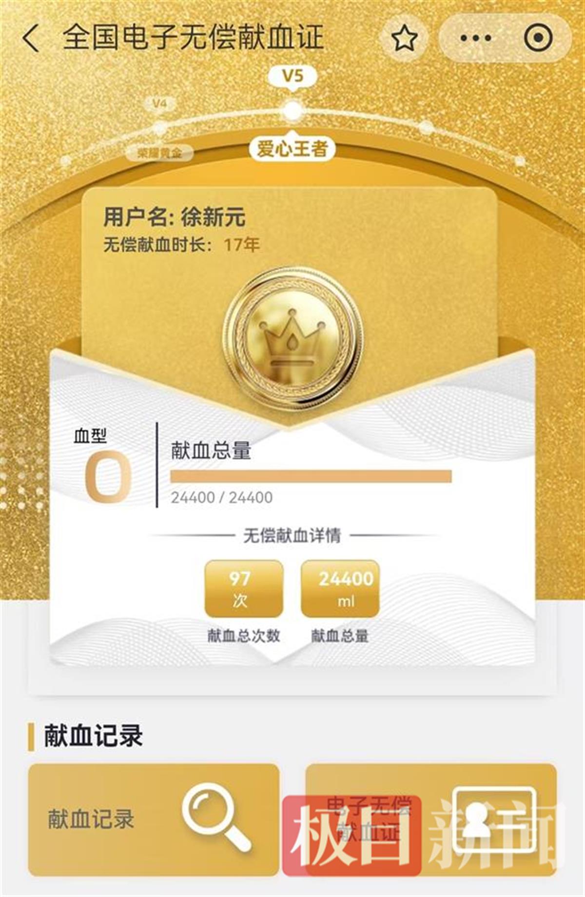 徐新元的电子献血证上显示,其已达到了“爱心王者”级别