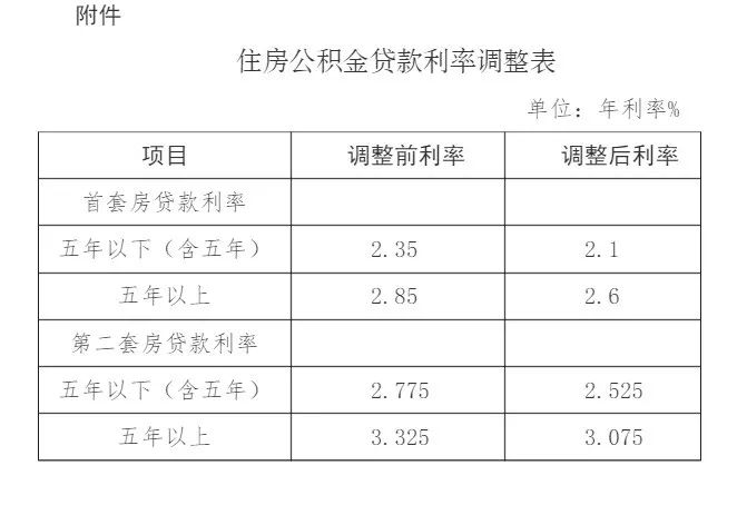 一、5年以下(含5年)首套个人住房公积金贷款利率由2.35%调整为2.1%,5年以上首套个人住房公积金贷款利率由2.85%调整为2.6%。5年以下(含5年)第二套个人住房公积金贷款利率由2.775%调整为2.525%,5年以上第二套个人住房公积金贷款利率由3.325%调整为3.075%。