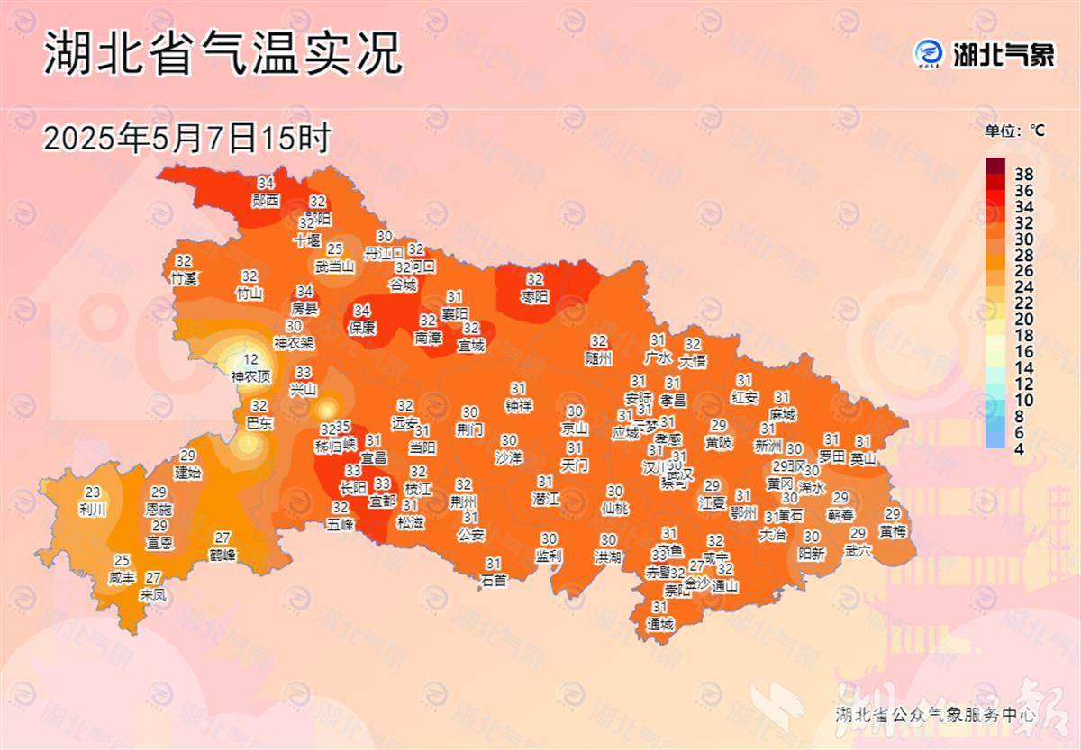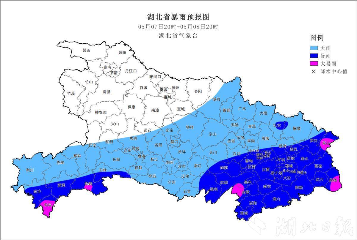 预计7日晚,恩施、宜昌南部、荆州南部会有大到暴雨,局地大暴雨,其他地区以小到中雨为主。8日白天,随州、荆门、荆州及其以东地区会有大到暴雨局部大暴雨,其他地区有小到中雨,此外,由于冷暖空气对峙,部分地区将会伴有明显的雷电、短时强降水和雷暴大风等强对流天气。8日晚,本轮降雨过程基本结束。受降雨及冷空气影响,8日气温会明显下降,最高气温降至22至27℃,同时省内北风加大,阵风可达5到7级。9至10日,省内大部地区转为晴到多云天气,气温有所回升。10日,风力将逐渐减弱。