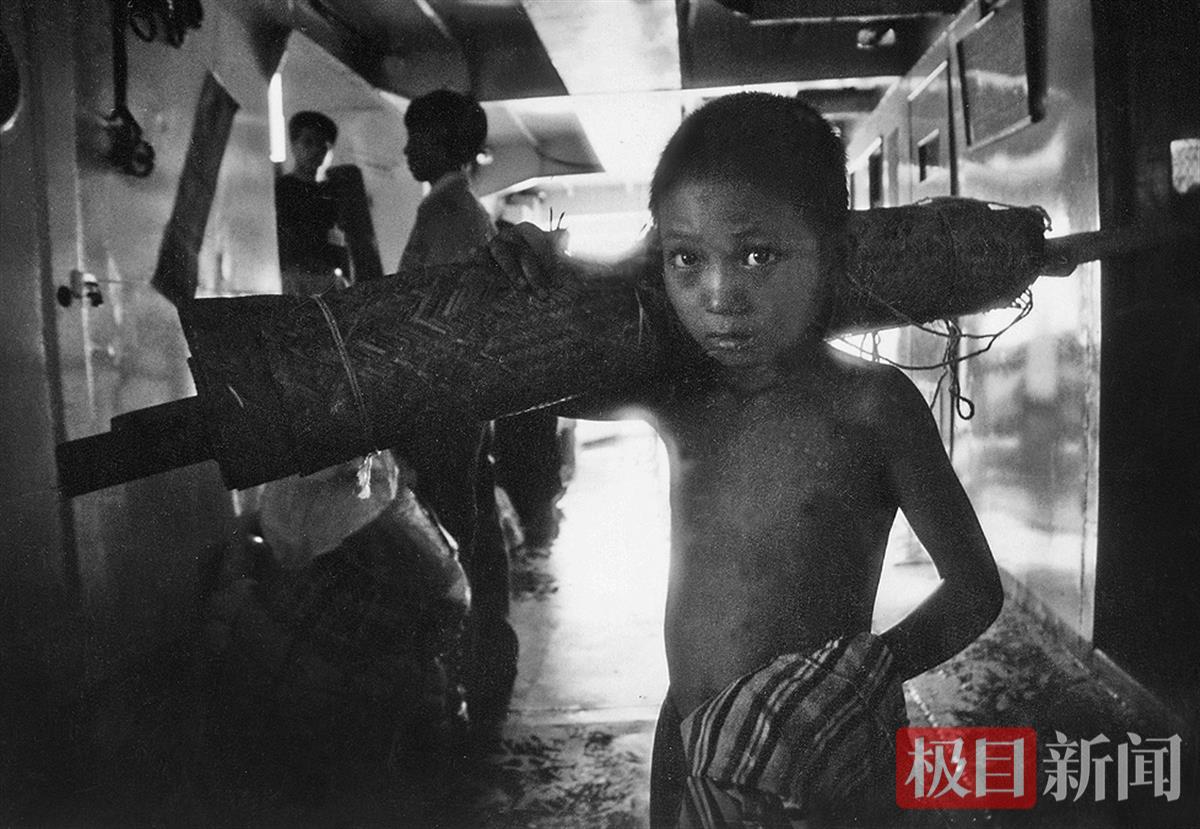 1995年6月25日中午秭归县的一条小班船上,7岁的小移民刘伟扛着自己的凉席,从坝上库首的秭归县向家村移民到宜昌市