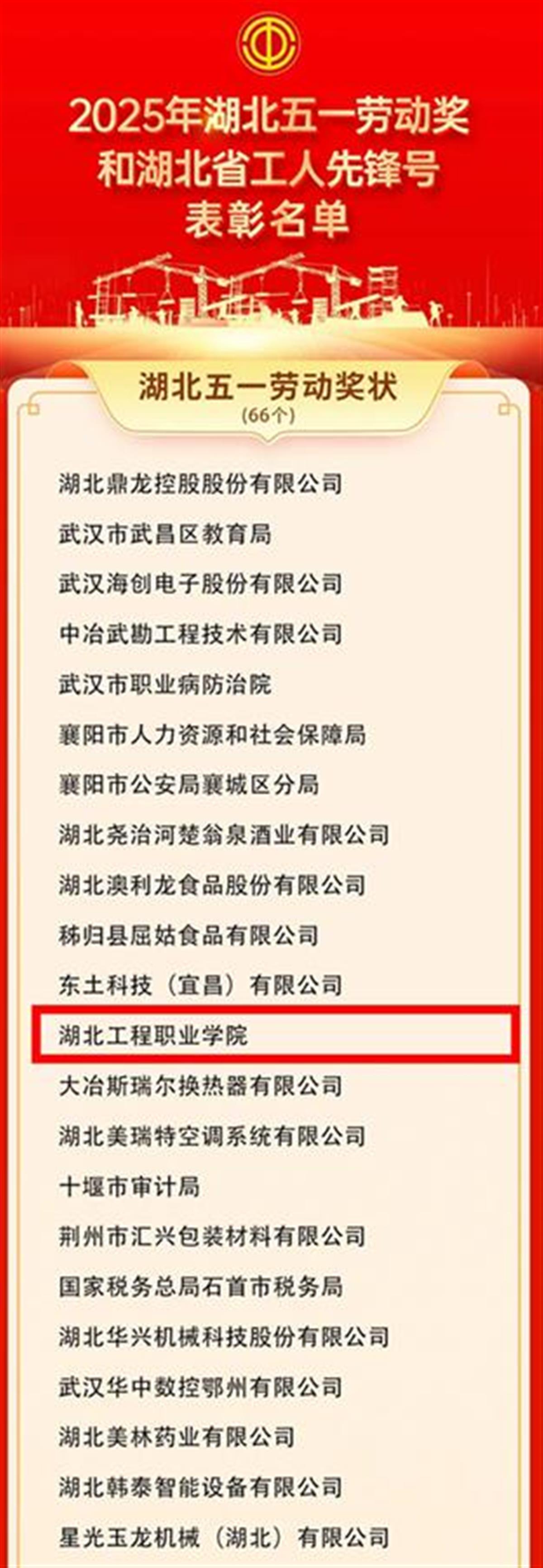 近日,2025年湖北省五一劳动奖和湖北省工人先锋号名单揭晓。湖北工程职业学院凭借在职业教育领域的突出贡献,荣获湖北省“五一”劳动奖。这一全省重量级荣誉,既是对该校“技能报国、匠心育人”办学成果的高度肯定,更凝聚着全体师生扎根黄石、服务产业的奋斗足迹。