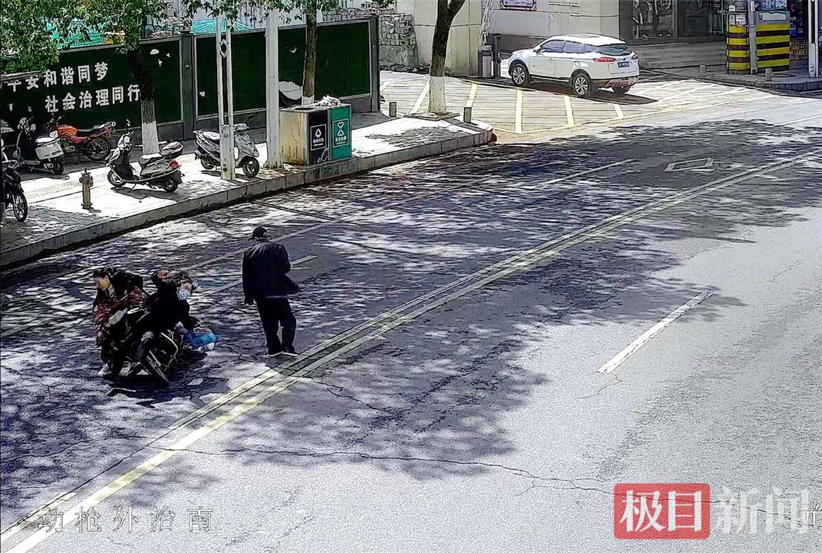 当日上午10时1分,保康县城光纤路上人来车往。一对老年夫妇从新建的新街社区办公楼前(原机械局)的公交站台横穿马路时,老奶奶被一辆疾驶而来的两轮摩托车撞倒在地,其手臂和腿都因摩托车撞击受伤,老奶奶表情痛苦,坐在路中央无法动弹,老爷爷蹲在身旁茫然无措。