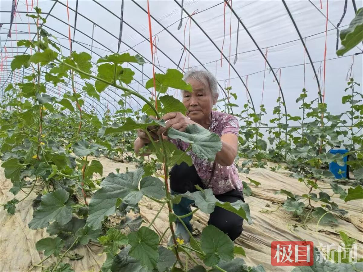 在香瓜地里,68岁的村民潘金英老人正麻利地掐去多余的瓜丝,引导瓜藤爬上一条条垂带。