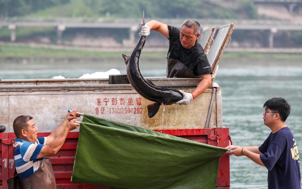 在四川省宜宾市三江口长江公园,工作人员将放流的长江鲟搬运到增殖放流池(2024年6月6日摄)。新华社发(庄歌尔 摄)