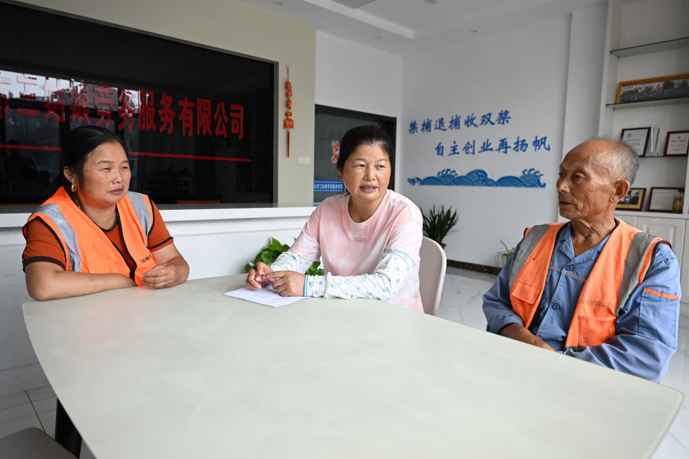 在安徽马鞍山市三姑娘劳务服务有限公司,陈兰香(中)和工作人员交流(2023年7月24日摄)。陈兰香是安徽省马鞍山市薛家洼的上岸渔民,在当地政府的帮助下,她和其他渔民合伙开办了劳务服务公司,主营保洁、绿化养护等服务。新华社记者 周牧 摄