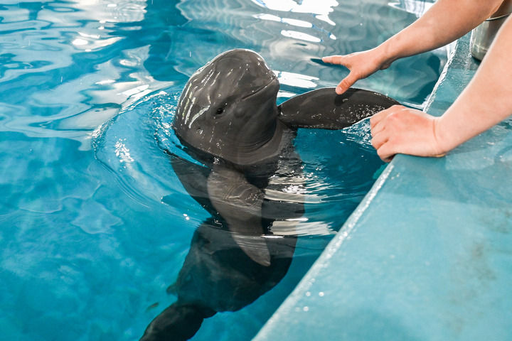 在位于湖北省武汉市的中国科学院水生生物研究所长江江豚繁育研究中心,训练员给长江江豚喂食(2025年4月17日摄)。新华社记者 杜子璇 摄