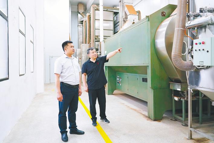 汉川市回龙镇党委书记杨峰(左)与加米食品(湖北)有限公司生产负责人交流增线扩产事宜。(湖北日报全媒记者 王欣 摄)