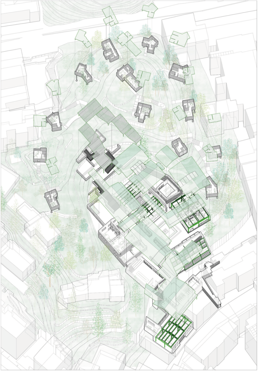 项目位于二战时期湖北省邮政总局旧址,历史建筑与山地景观有机共存,浓缩了古城特有的风貌,是体验当地自然与人文特色的绝佳所在。“微缩恩施”将古城街道肌理、建筑风貌、传统文化和民生智慧融入酒店设计,并植入多朝向、多户型木屋作为“古城取景框”,让酒店化身历史记忆的容器,将被遗弃的历史场域转化为激活古城记忆的触媒,实现“此时此地”与历史时空的叠合。
