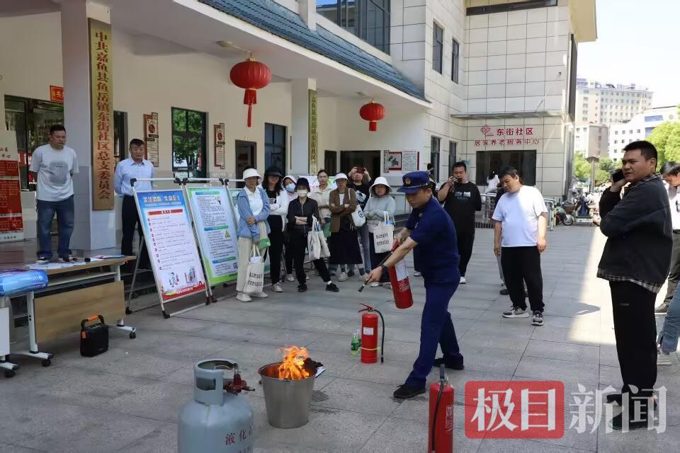 “大家不要慌张,这是演示如何扑灭煤气罐火灾”“我们用湿毛巾包住手,迅速靠近煤气罐关闭阀门,之后拿起灭火器站在上风向,对准火焰根部喷射,直至火焰熄灭。”5月12日上午,在嘉鱼县鱼岳镇东街社区,“火焰蓝”宣教队设置咨询展位,为在场群众提供咨询服务,发放涵盖火灾预防、应急逃生等内容的宣传资料,耐心解答群众关于消防安全的疑问。在演练环节,“火焰蓝”宣教队首先为群众详细讲解煤气罐起火的危险性,并进行实操演示。现场群众直观了解到煤气罐起火的正确应对方法,增强大家处理此类火灾事故的能力。“今天我拿到安全常识宣传手册,自己学习后,还要带回去给家人看,让全家一起增强防灾减灾的意识。”居民刘女士说。