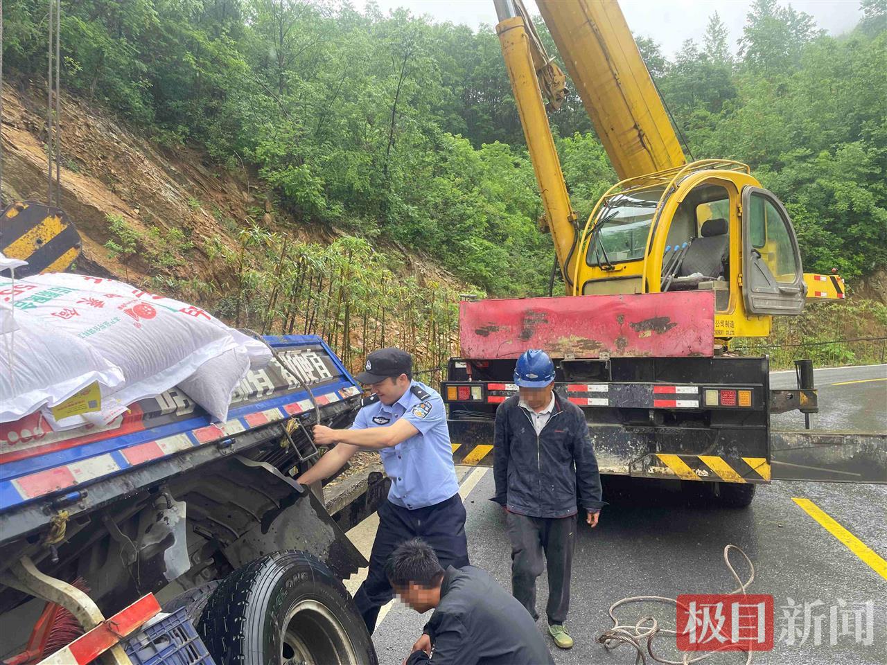 5月11日凌晨,在湖北省S305省道襄阳市保康县龙坪镇朱砂村路段,一辆满载饲料的外地大货车,由于雨夜视线差、车速快,拐弯下坡时不慎侧翻边沟,幸无人员受伤。警情发生后,当地民警连夜找来塑料薄膜遮盖饲料,并于清晨调来吊车助其脱困,为车主挽回了经济损失。